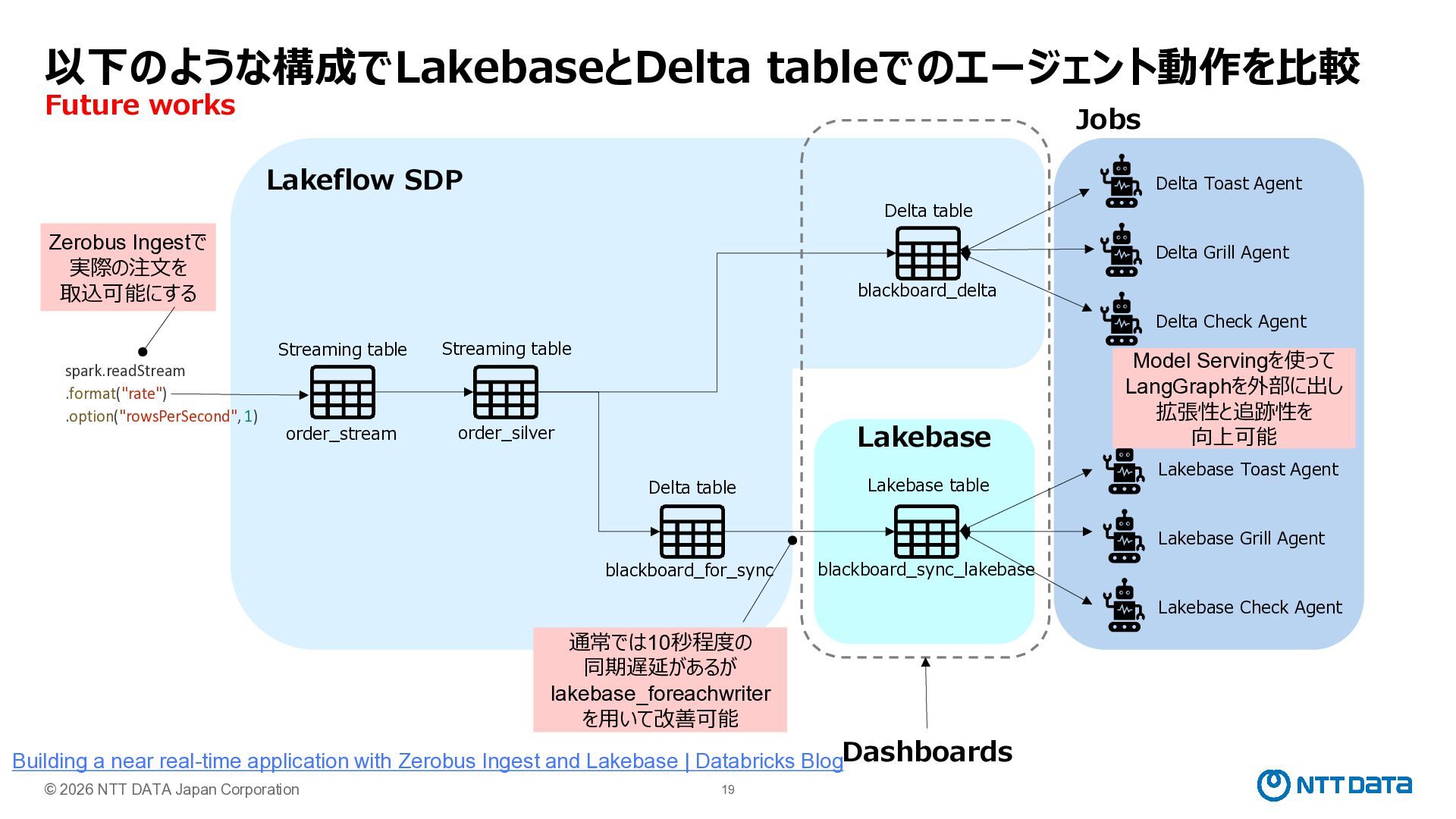works Streaming table Streaming table order_stream order_silver Delta table Delta table blackboard_delta blackboard_for_sync Lakebase table blackboard_sync_lakebase spark.readStream .format("rate") .option("rowsPerSecond", 1) Delta Toast Agent Delta Grill Agent Delta Check Agent Lakebase Toast Agent Lakebase Grill Agent Lakebase Check Agent Jobs Dashboards Lakeflow SDP Lakebase Zerobus Ingestで 実際の注文を 取込可能にする 通常では10秒程度の 同期遅延があるが lakebase_foreachwriter を用いて改善可能 Model Servingを使って LangGraphを外部に出し 拡張性と追跡性を 向上可能 Building a near real-time application with Zerobus Ingest and Lakebase | Databricks Blog