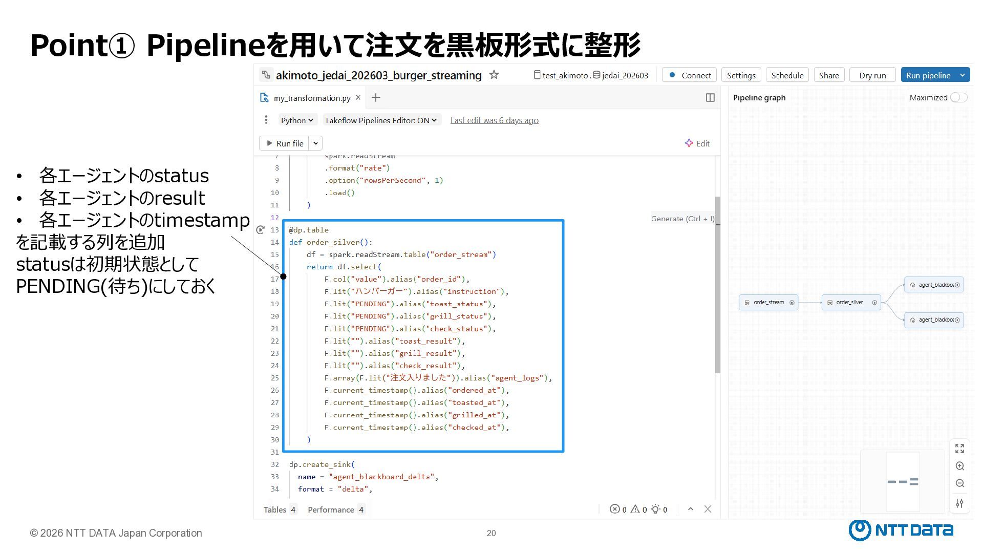 10. © 2026 NTT DATA Japan Corporation 20 Point① Pipelineを用いて注文を黒板形式に整形 •