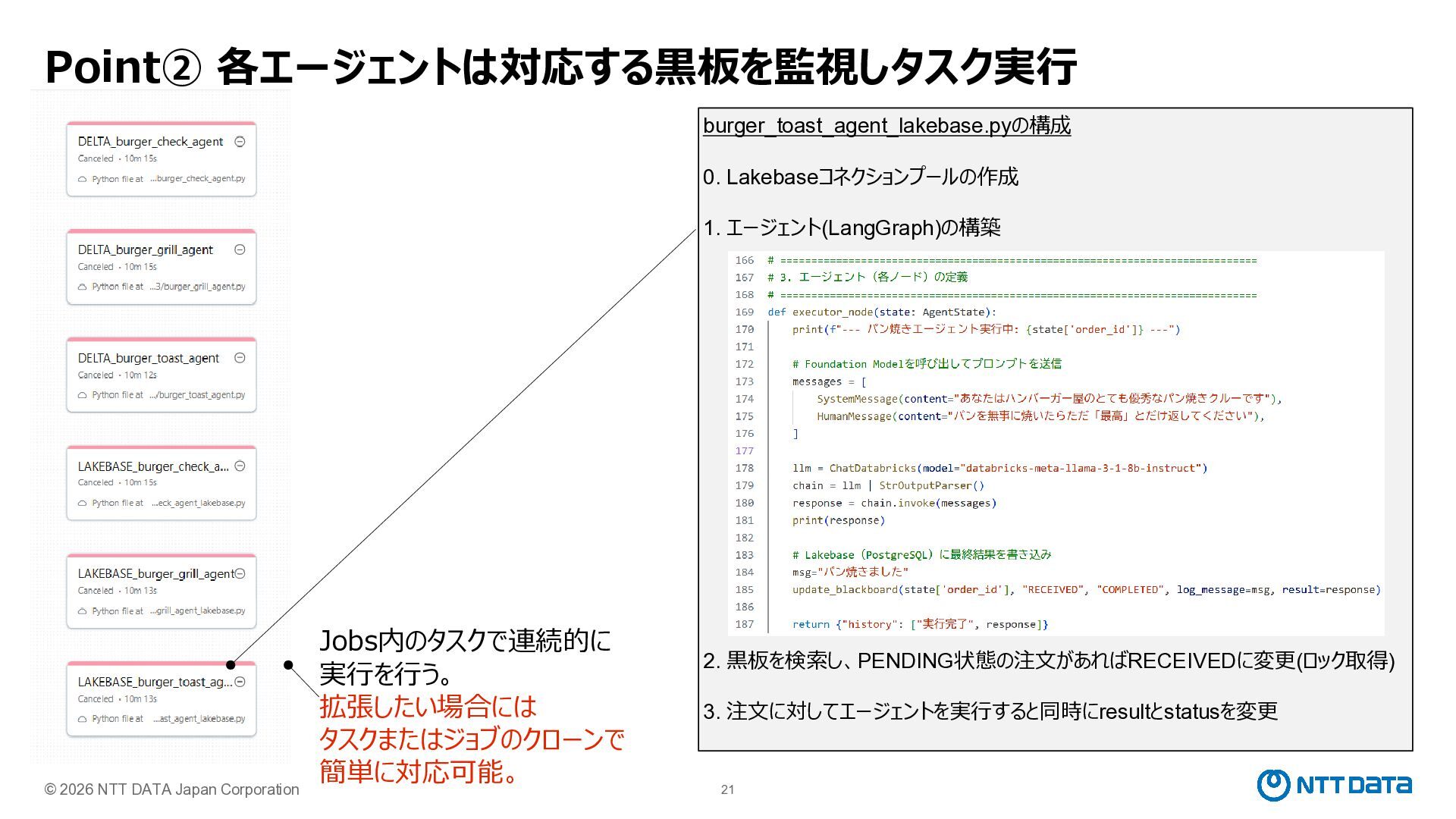 11. © 2026 NTT DATA Japan Corporation 21 Point② 各エージェントは対応する黒板を監視しタスク実行 Jobs内のタスクで連続的に