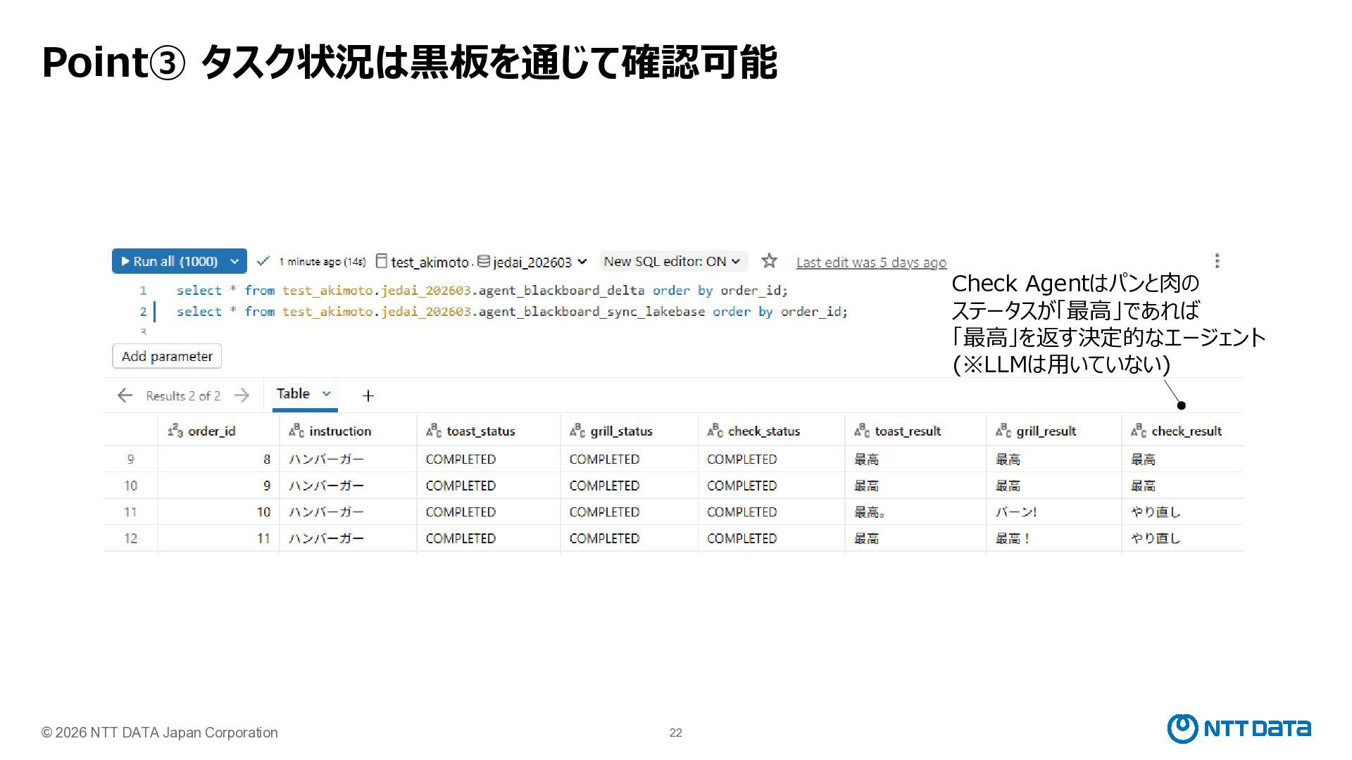 Streaming table Streaming table order_stream order_silver Delta table Delta table blackboard_delta blackboard_for_sync Lakebase table blackboard_sync_lakebase spark.readStream .format("rate") .option("rowsPerSecond", 1) Delta Toast Agent Delta Grill Agent Delta Check Agent Lakebase Toast Agent Lakebase Grill Agent Lakebase Check Agent Jobs Dashboards Lakeflow SDP Lakebase 1秒に1回注文 Pipelineを用いて 注文を黒板形式に 整形 Point① GUIを用いて Delta tableを Lakebaseに同期設定 各エージェントは 対応する黒板を監視し タスク実行 Point② タスク状況は 黒板を通じて 確認可能 Point③