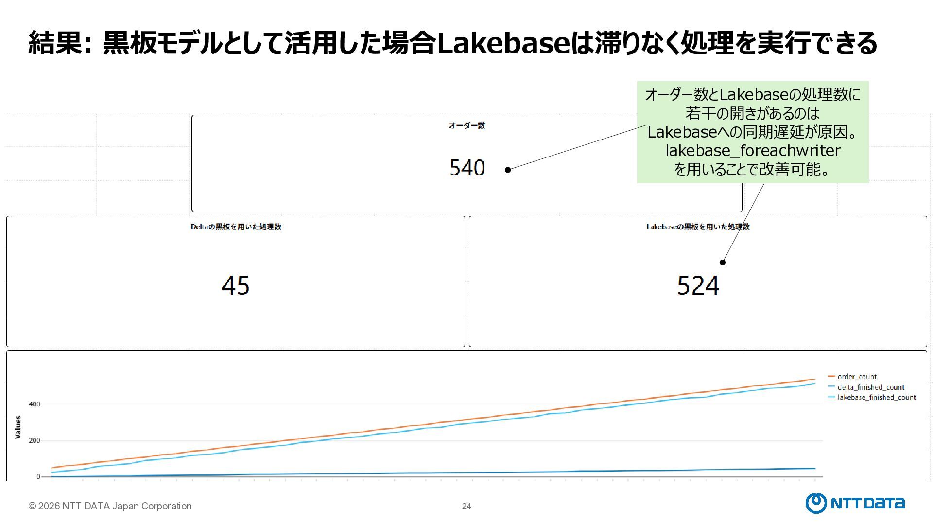 13. © 2026 NTT DATA Japan Corporation 24 結果: 黒板モデルとして活用した場合Lakebaseは滞りなく処理を実行できる オーダー数とLakebaseの処理数に