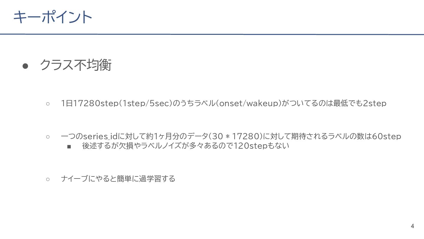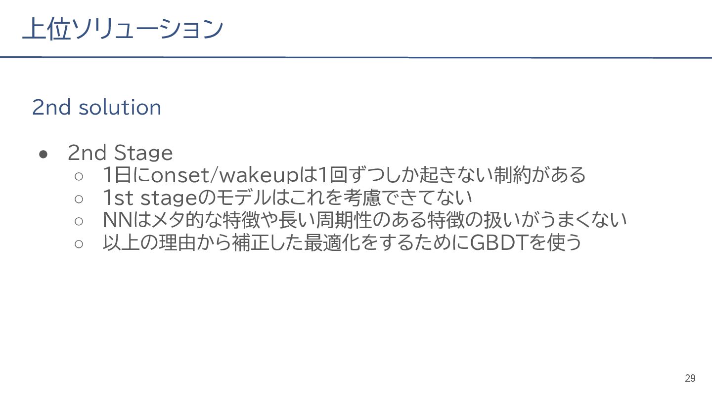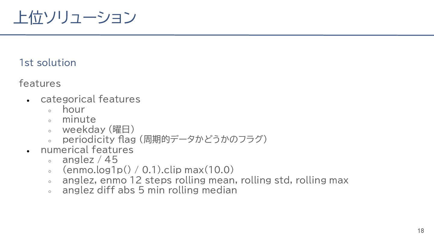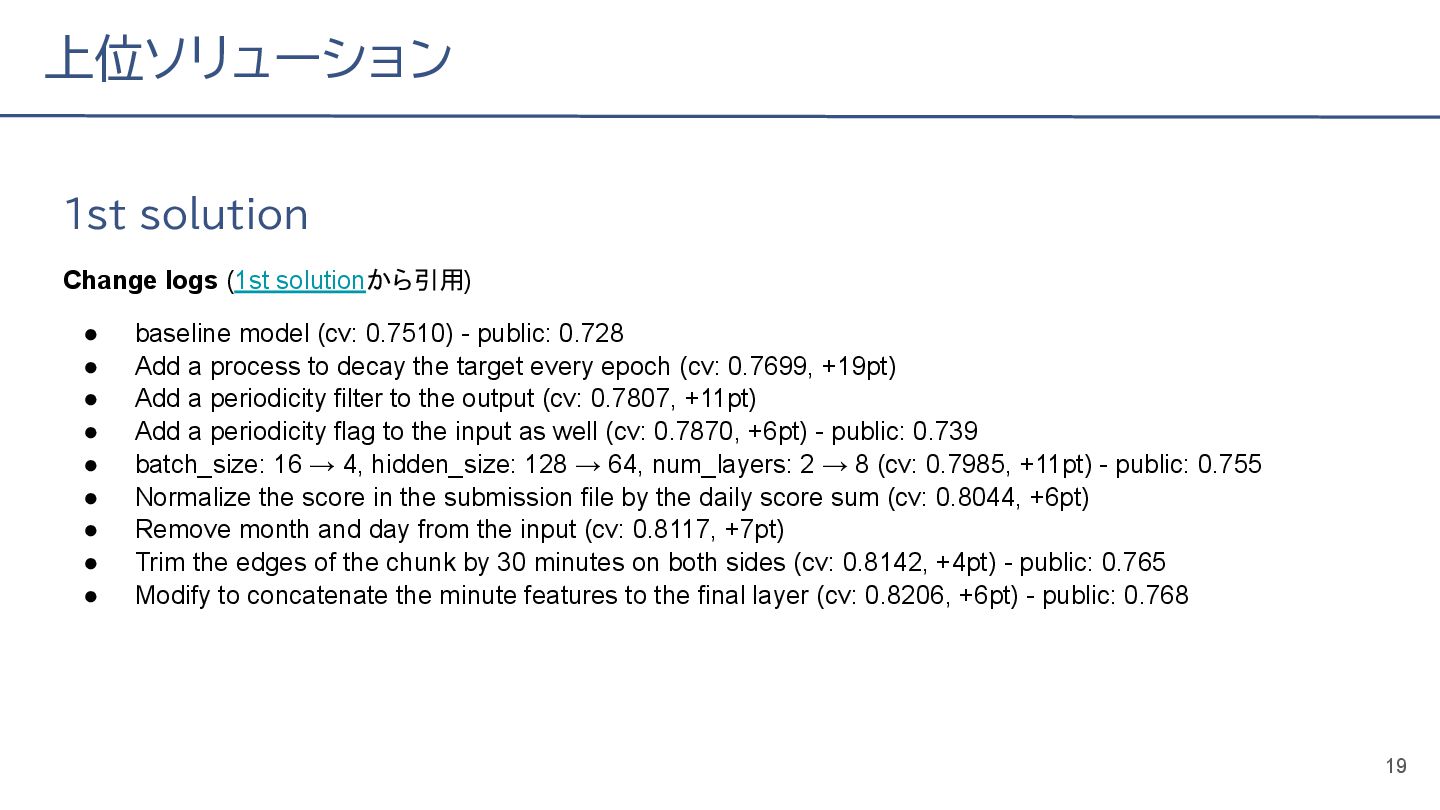 (cv: 0.7510) - public: 0.728 • Add a process to decay the target every epoch (cv: 0.7699, +19pt) • Add a periodicity filter to the output (cv: 0.7807, +11pt) • Add a periodicity flag to the input as well (cv: 0.7870, +6pt) - public: 0.739 • batch_size: 16 → 4, hidden_size: 128 → 64, num_layers: 2 → 8 (cv: 0.7985, +11pt) - public: 0.755 • Normalize the score in the submission file by the daily score sum (cv: 0.8044, +6pt) • Remove month and day from the input (cv: 0.8117, +7pt) • Trim the edges of the chunk by 30 minutes on both sides (cv: 0.8142, +4pt) - public: 0.765 • Modify to concatenate the minute features to the final layer (cv: 0.8206, +6pt) - public: 0.768 19