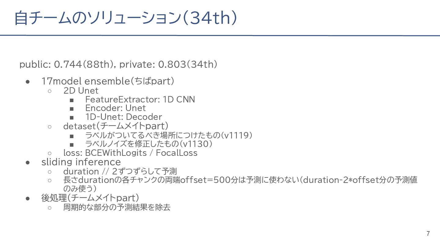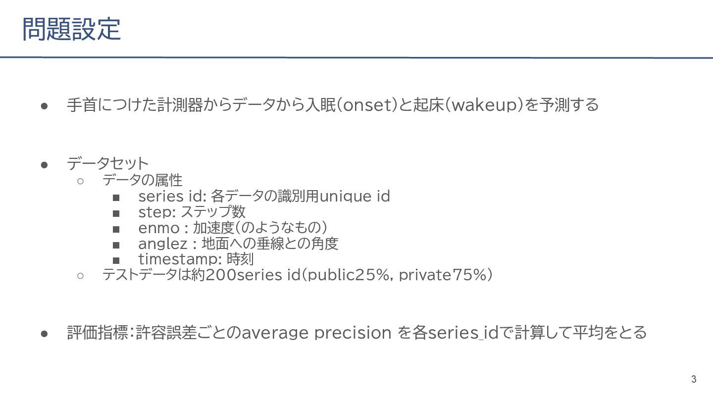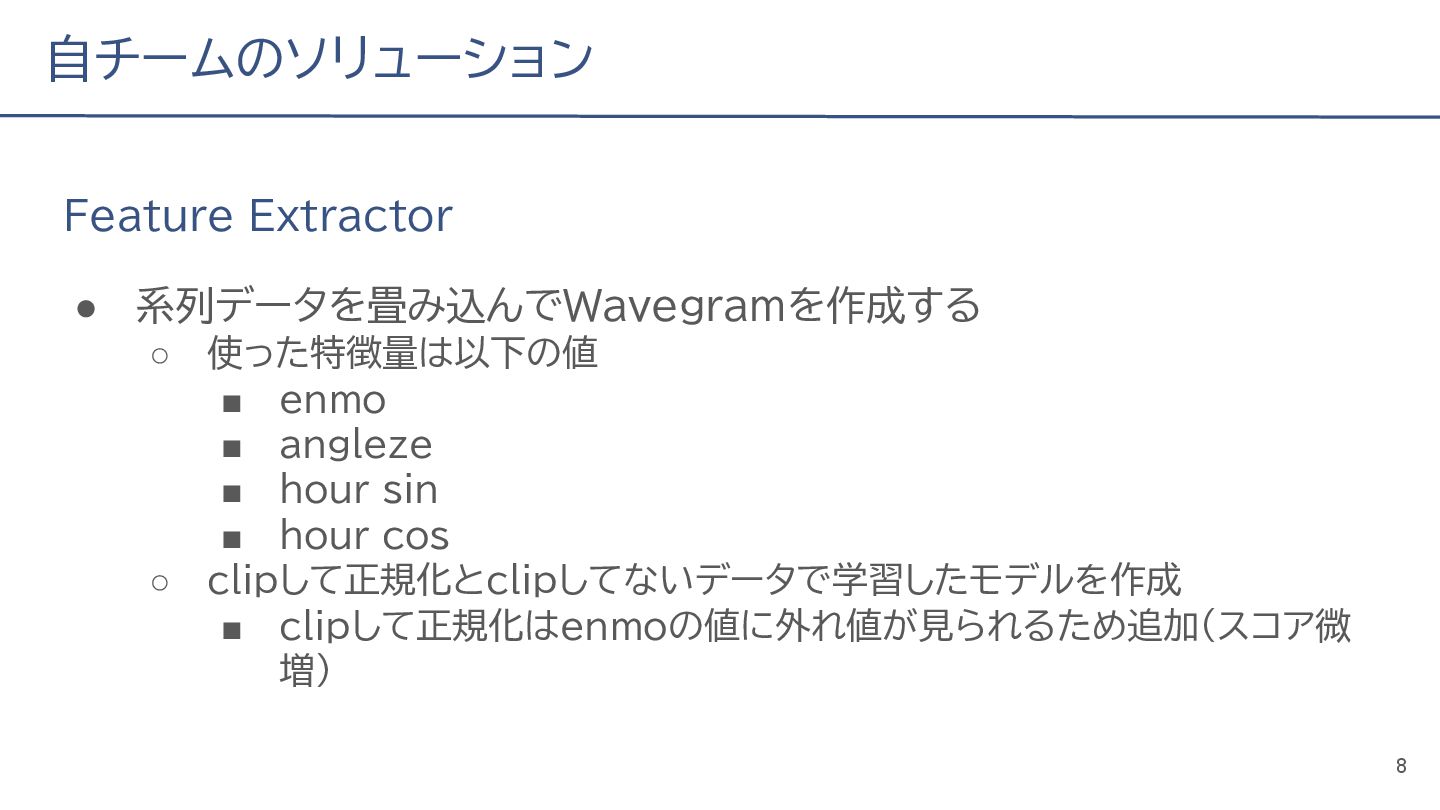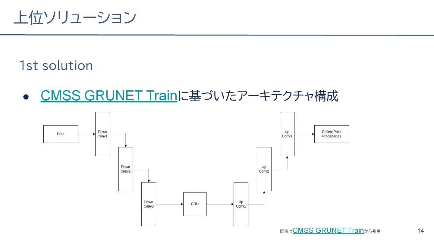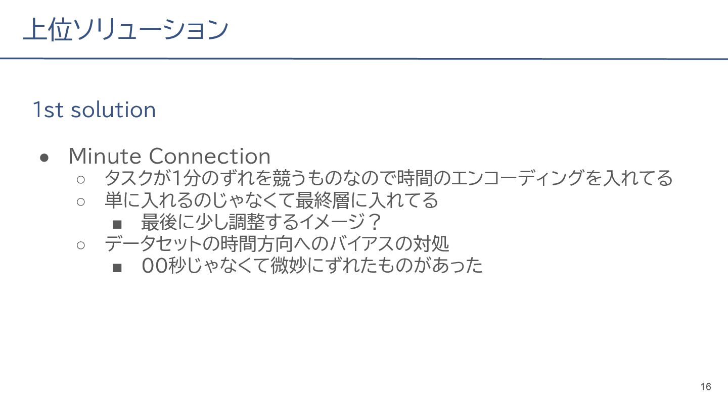 (cv: 0.7510) - public: 0.728 • Add a process to decay the target every epoch (cv: 0.7699, +19pt) • Add a periodicity filter to the output (cv: 0.7807, +11pt) • Add a periodicity flag to the input as well (cv: 0.7870, +6pt) - public: 0.739 • batch_size: 16 → 4, hidden_size: 128 → 64, num_layers: 2 → 8 (cv: 0.7985, +11pt) - public: 0.755 • Normalize the score in the submission file by the daily score sum (cv: 0.8044, +6pt) • Remove month and day from the input (cv: 0.8117, +7pt) • Trim the edges of the chunk by 30 minutes on both sides (cv: 0.8142, +4pt) - public: 0.765 • Modify to concatenate the minute features to the final layer (cv: 0.8206, +6pt) - public: 0.768 19