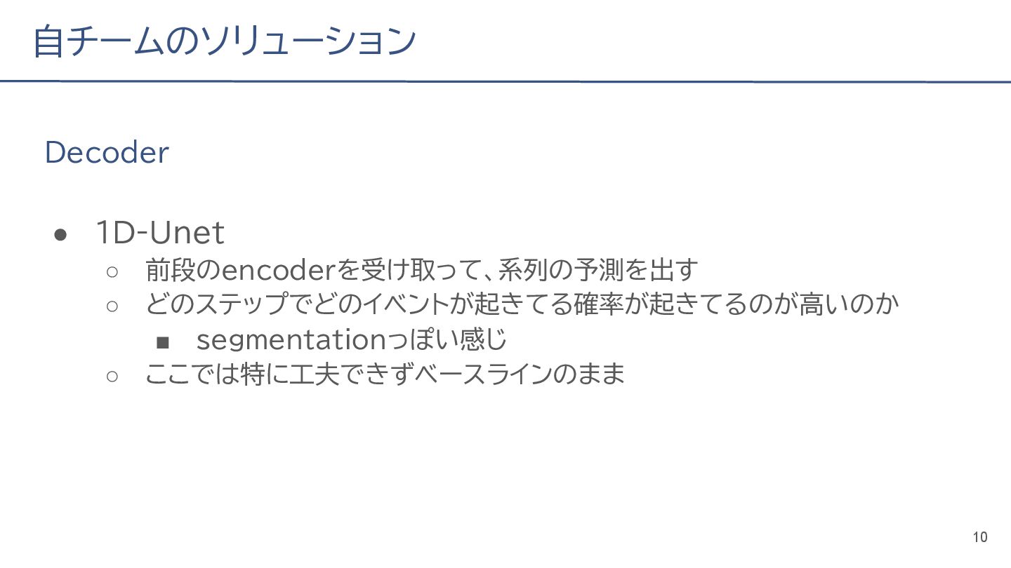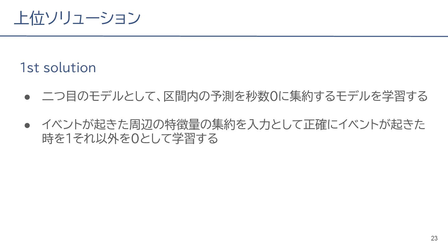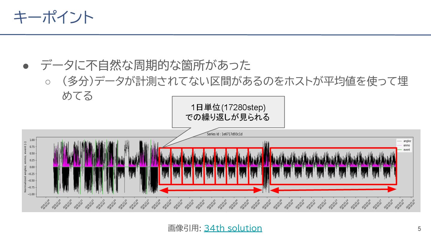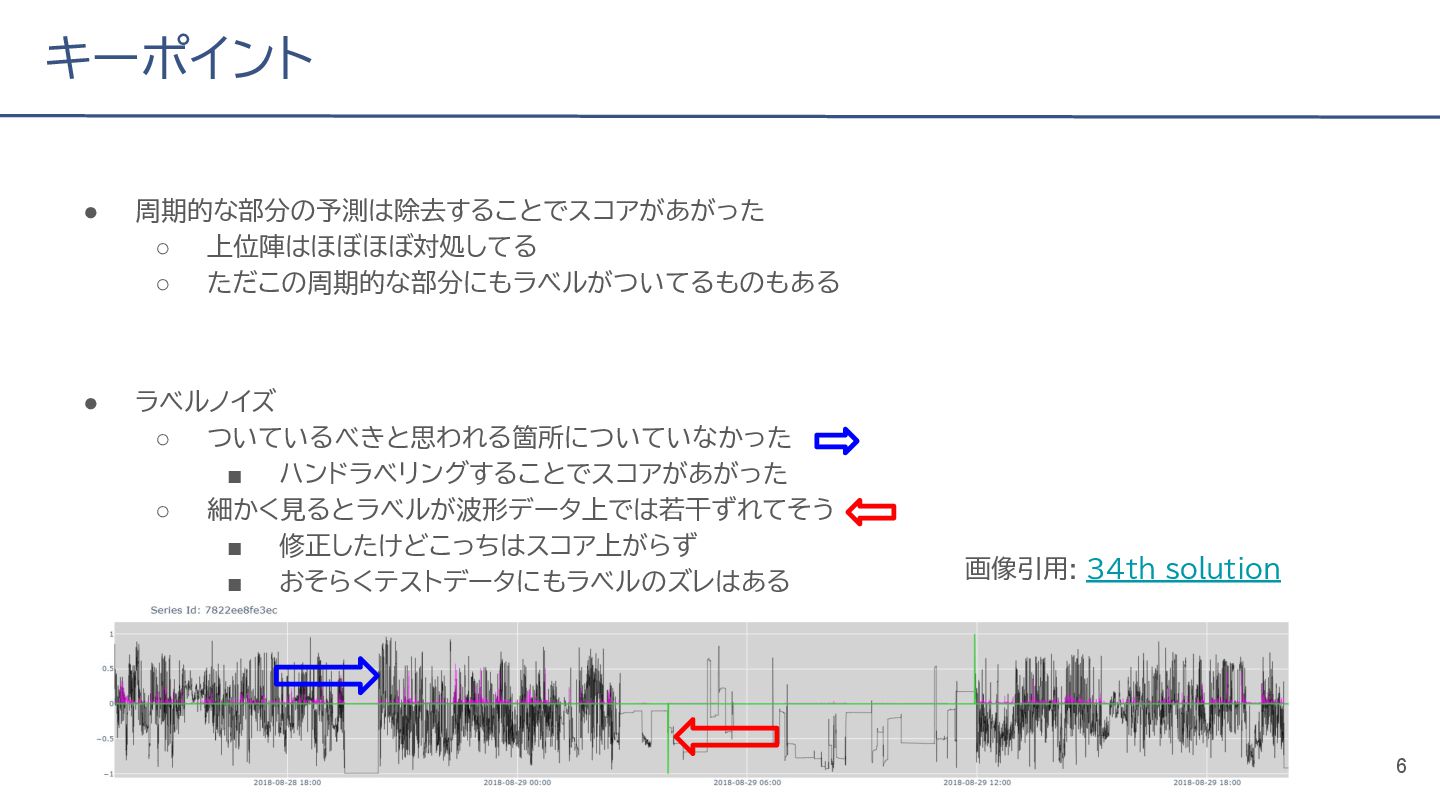 (cv: 0.7510) - public: 0.728 • Add a process to decay the target every epoch (cv: 0.7699, +19pt) • Add a periodicity filter to the output (cv: 0.7807, +11pt) • Add a periodicity flag to the input as well (cv: 0.7870, +6pt) - public: 0.739 • batch_size: 16 → 4, hidden_size: 128 → 64, num_layers: 2 → 8 (cv: 0.7985, +11pt) - public: 0.755 • Normalize the score in the submission file by the daily score sum (cv: 0.8044, +6pt) • Remove month and day from the input (cv: 0.8117, +7pt) • Trim the edges of the chunk by 30 minutes on both sides (cv: 0.8142, +4pt) - public: 0.765 • Modify to concatenate the minute features to the final layer (cv: 0.8206, +6pt) - public: 0.768 19