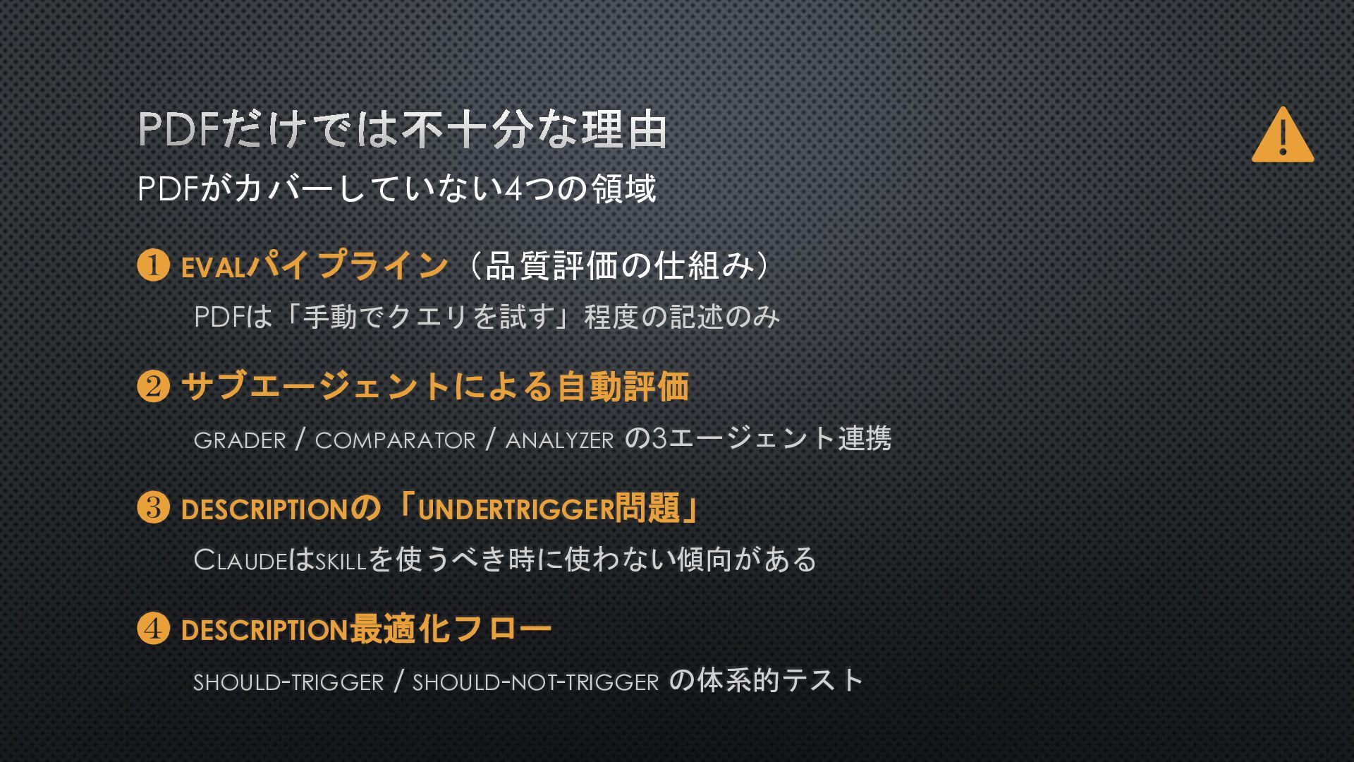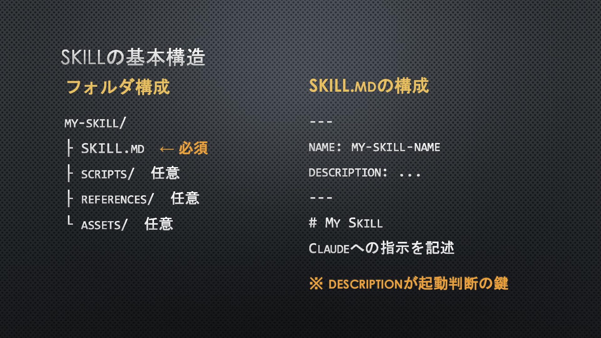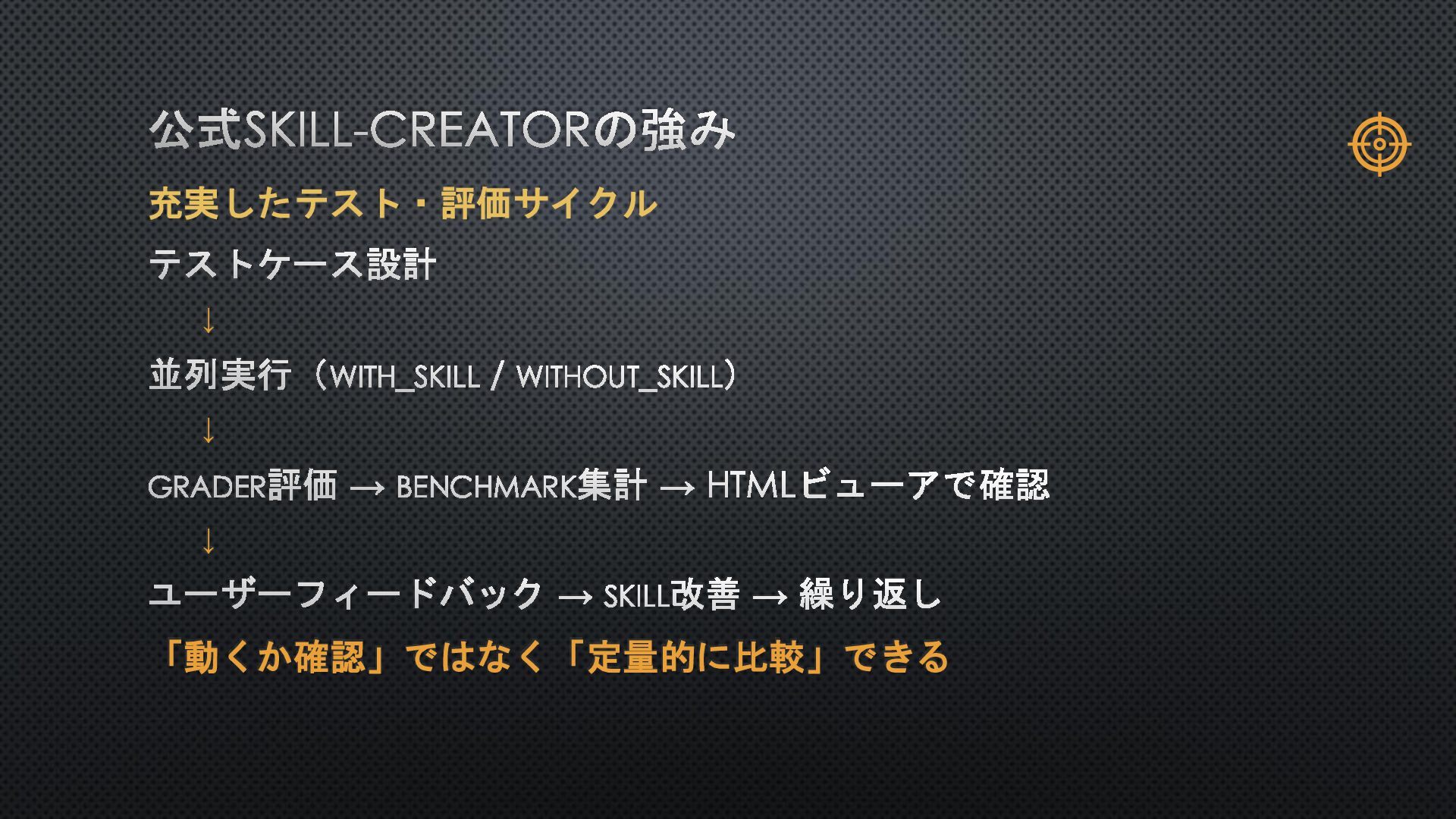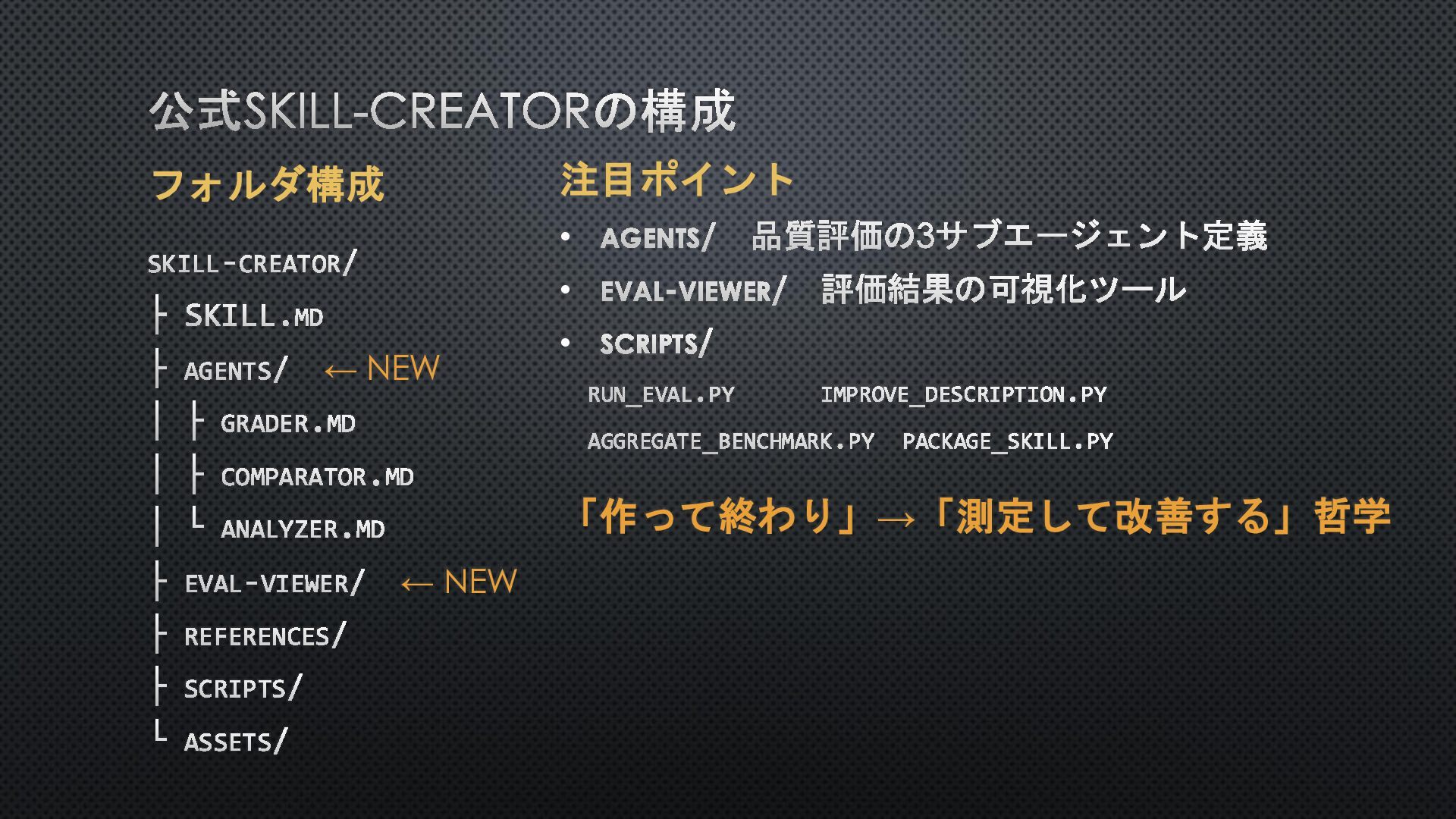 ├ GRADER.MD │ ├ COMPARATOR.MD │ └ ANALYZER.MD ├ EVAL-VIEWER/ ← NEW ├ REFERENCES/ ├ SCRIPTS/ └ ASSETS/ 注目ポイント • AGENTS/ 品質評価の3サブエージェント定義 • EVAL-VIEWER/ 評価結果の可視化ツール • SCRIPTS/ RUN_EVAL.PY IMPROVE_DESCRIPTION.PY AGGREGATE_BENCHMARK.PY PACKAGE_SKILL.PY 「作って終わり」→「測定して改善する」哲学