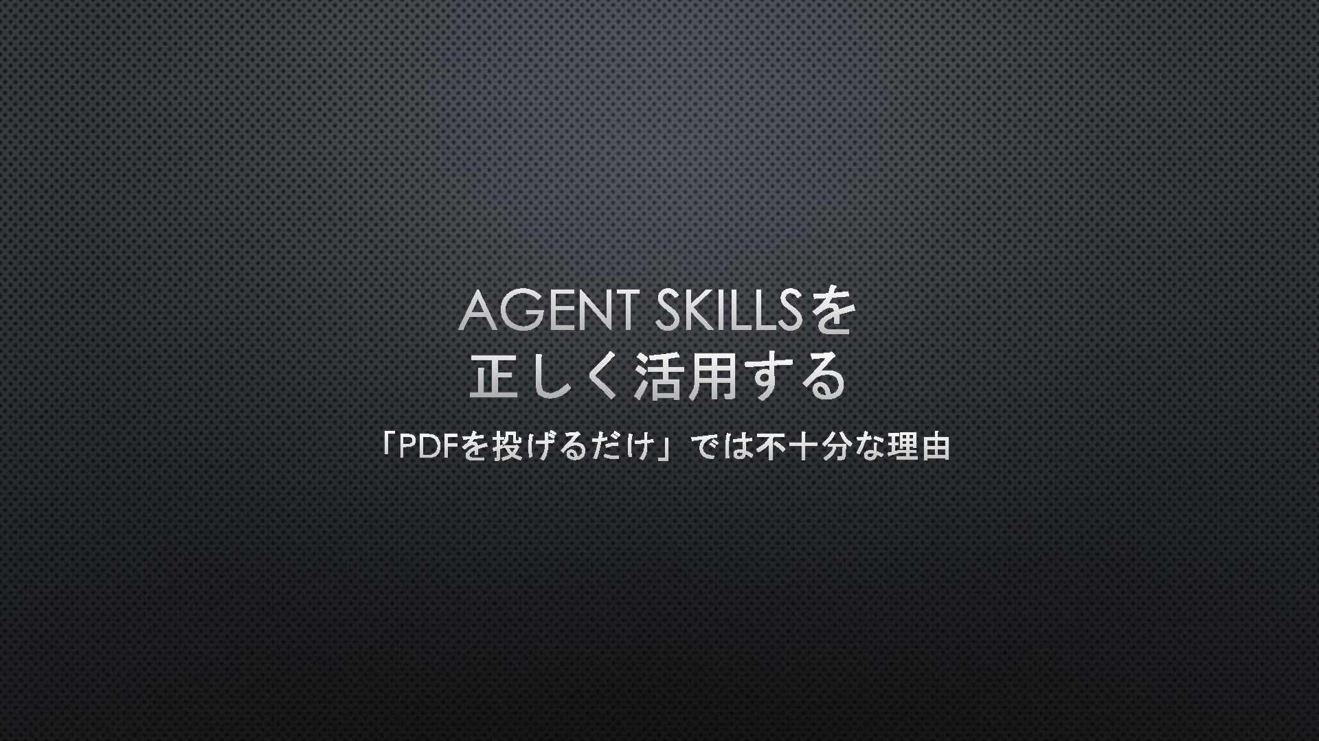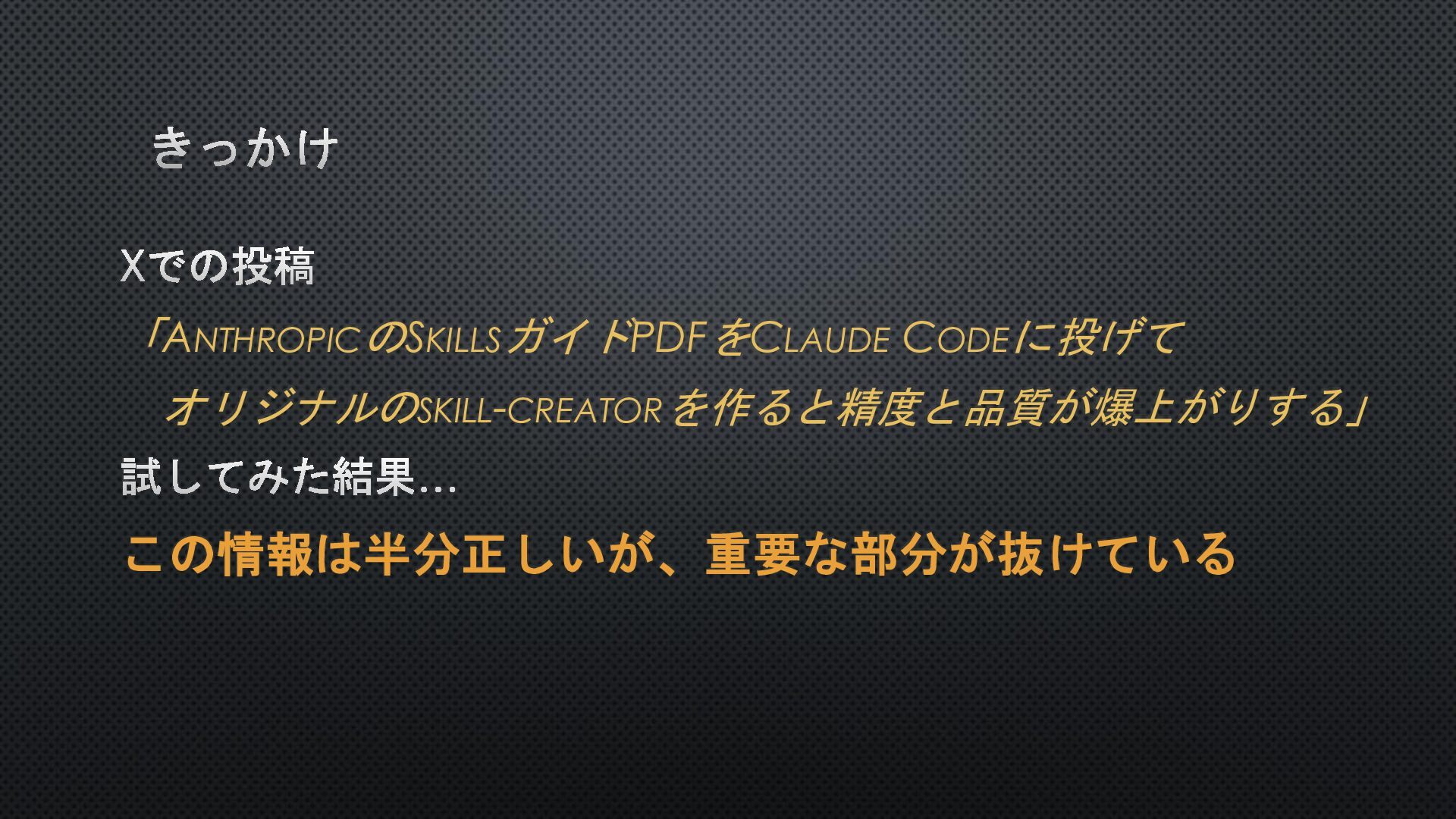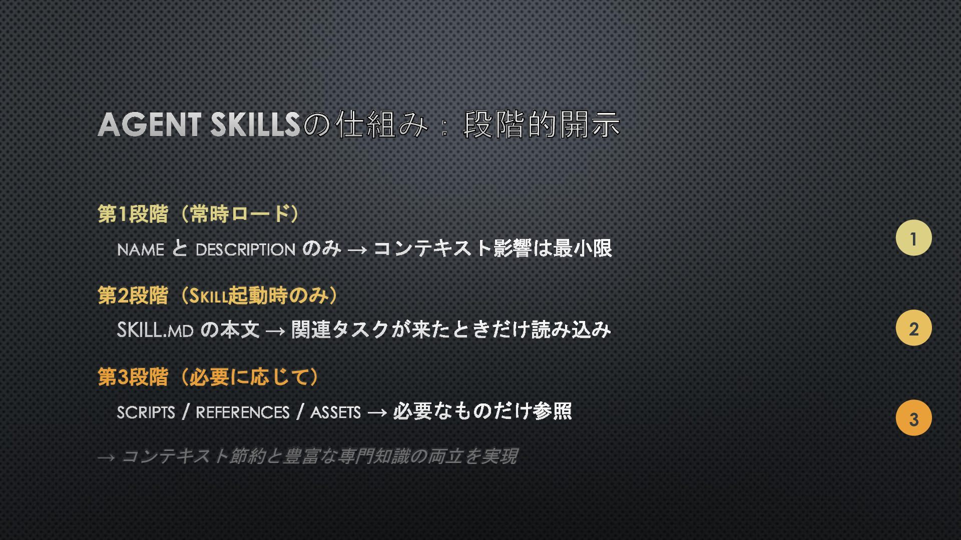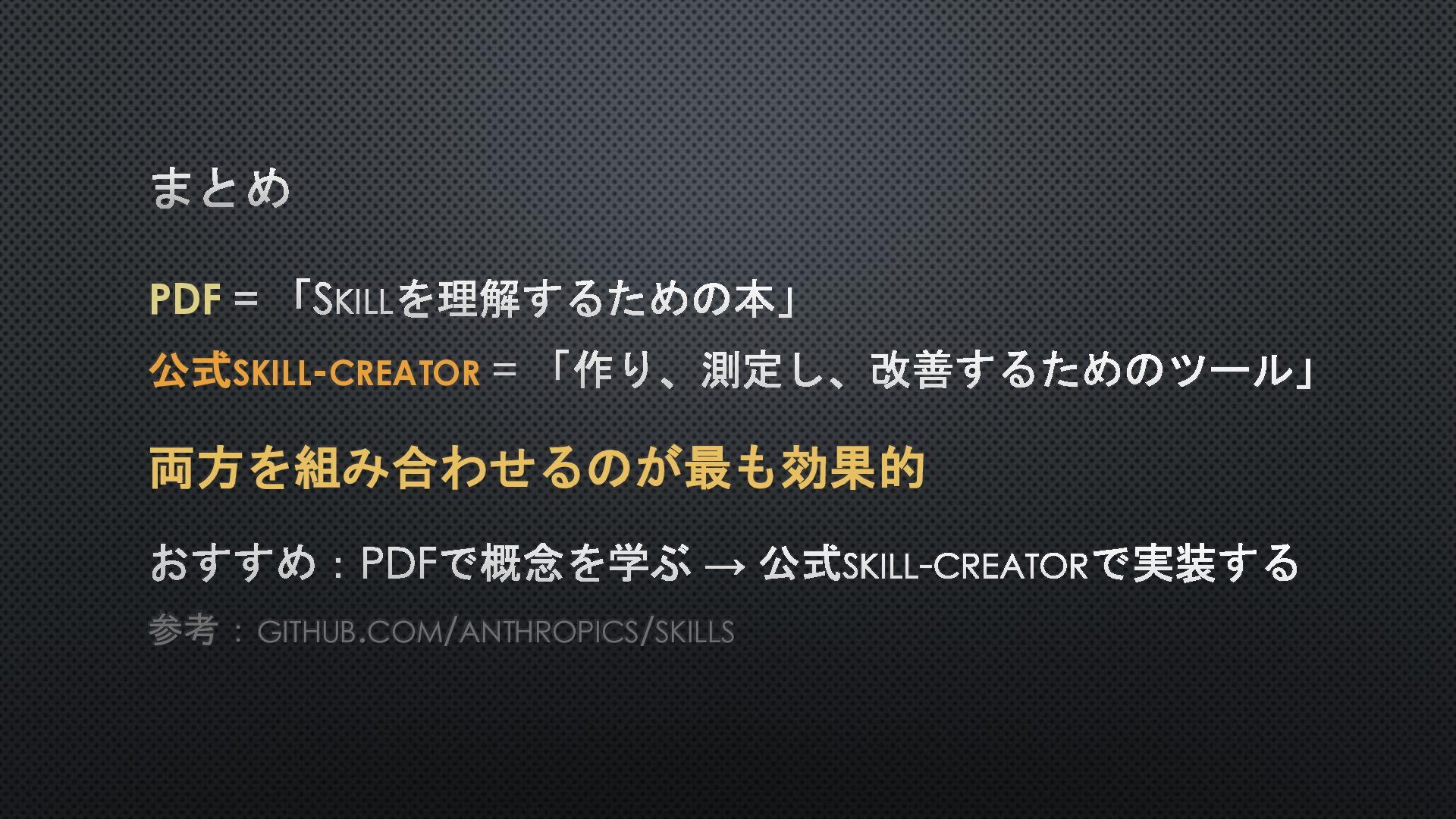 ├ GRADER.MD │ ├ COMPARATOR.MD │ └ ANALYZER.MD ├ EVAL-VIEWER/ ← NEW ├ REFERENCES/ ├ SCRIPTS/ └ ASSETS/ 注目ポイント • AGENTS/ 品質評価の3サブエージェント定義 • EVAL-VIEWER/ 評価結果の可視化ツール • SCRIPTS/ RUN_EVAL.PY IMPROVE_DESCRIPTION.PY AGGREGATE_BENCHMARK.PY PACKAGE_SKILL.PY 「作って終わり」→「測定して改善する」哲学