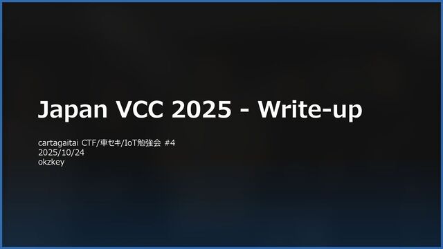 本資料は、cartagaitai CTF/車セキ/IoT勉強会 #4(connpass開催)で発表した「Japan VCC 2025 - Write-up」に関する資料です。チームcartagaitaiが実施する、車載機器やIoT機器を扱うCTF・セキュリティネタ・技術ネタに関する勉強会・発表の場です。本資料では、Japan VCC 2025(Vehicle Cybersecurity Competition 2025 招待制大会)で出題された「VIN」と「Secure boot」の問題を解説します。なおチームの戦績は完答で1位です。