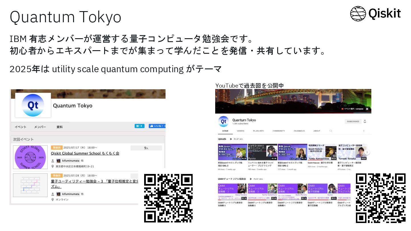 Quantum Tokyo IBM 有志メンバーが運営する量子コンピュータ勉強会です。 初心者からエキスパートまでが集まって学んだことを発信・共有しています。 2025年は utility scale quantum computing