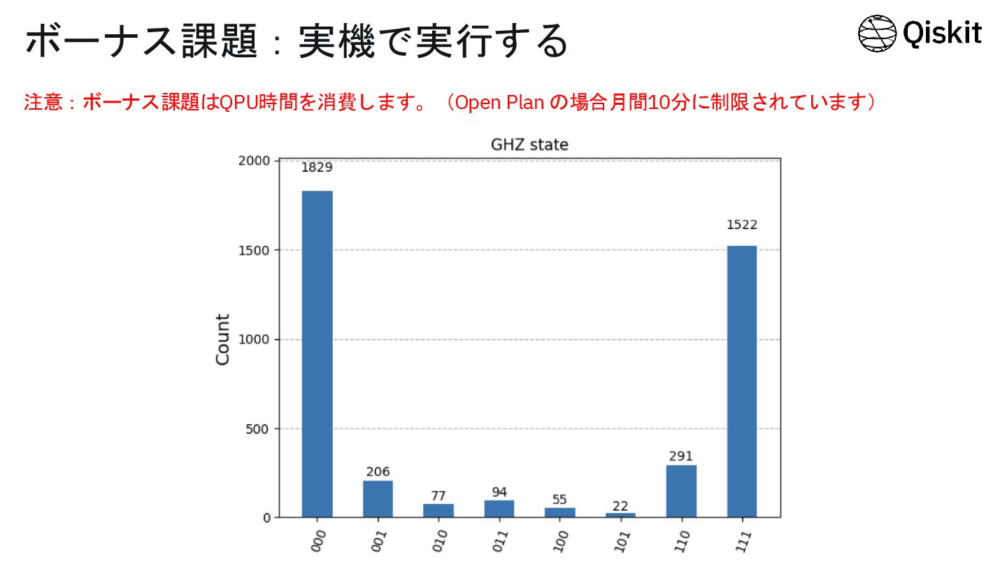 ボーナス課題:実機で実行する 注意:ボーナス課題はQPU時間を消費します。(Open Plan の場合月間10分に制限されています)