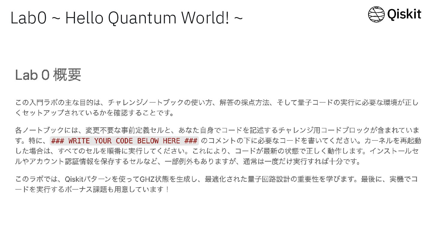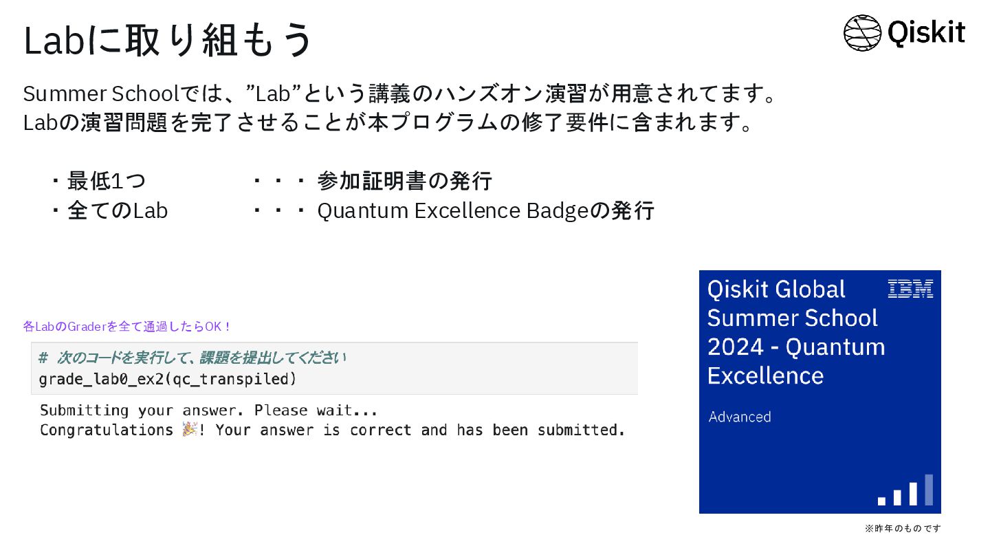 Qiskit Global Summer School 2025 1 前でLab0のデモを行います。 ・これからLabを始める方 ・始めてみたけどつまづいている方 はぜひご参照ください!