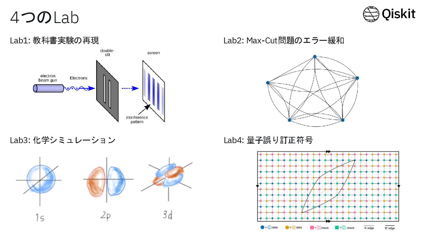 4つのLab Lab1: 教科書実験の再現 Lab2: Max-Cut問題のエラー緩和 Lab3: 化学シミュレーション Lab4: 量子誤り訂正符号