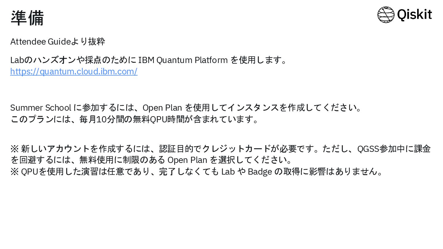 Attendee Guideより抜粋 Labのハンズオンや採点のために IBM Quantum Platform を使用します。 https://quantum.cloud.ibm.com/ Summer School