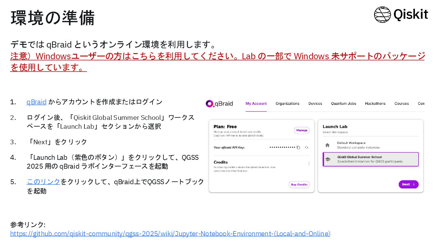 デモでは qBraid というオンライン環境を利用します。 注意)Windowsユーザーの方はこちらを利用してください。Lab の一部で Windows 未サポートのパッケージ を使用しています。 環境の準備 参考リンク: