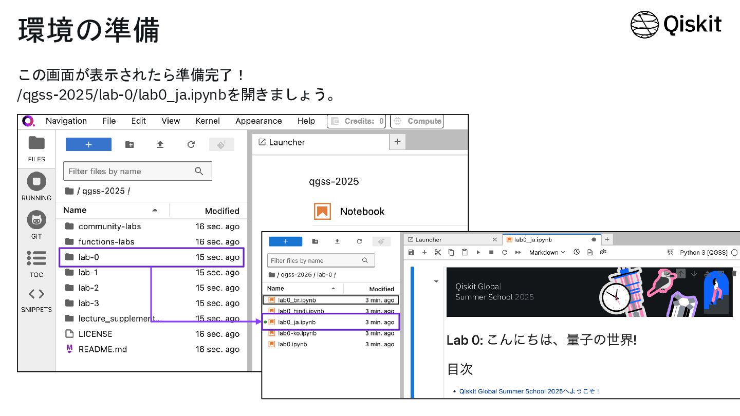 環境の準備 この画面が表示されたら準備完了! /qgss-2025/lab-0/lab0_ja.ipynbを開きましょう。