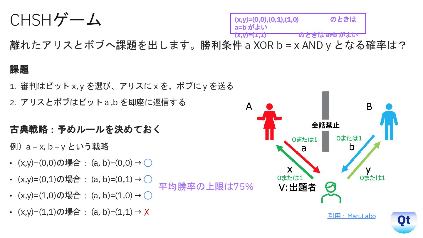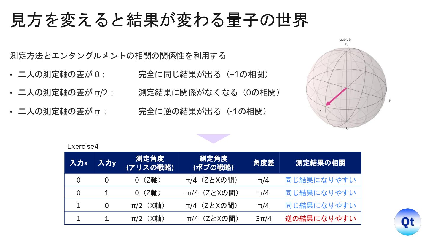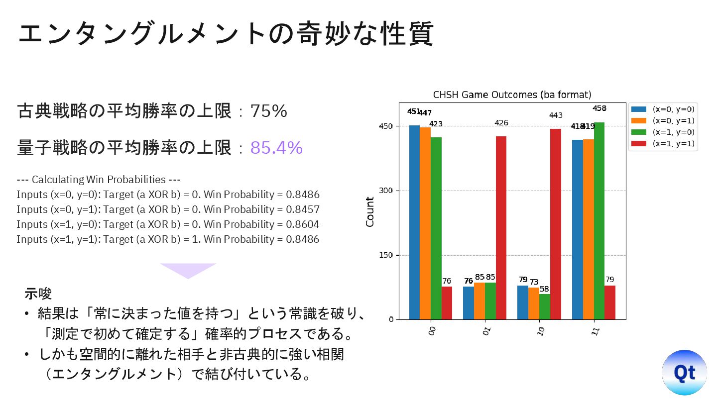 y=0): Target (a XOR b) = 0. Win Probability = 0.8486 Inputs (x=0, y=1): Target (a XOR b) = 0. Win Probability = 0.8457 Inputs (x=1, y=0): Target (a XOR b) = 0. Win Probability = 0.8604 Inputs (x=1, y=1): Target (a XOR b) = 1. Win Probability = 0.8486 示唆 • 結果は「常に決まった値を持つ」という常識を破り、 「測定で初めて確定する」確率的プロセスである。 • しかも空間的に離れた相手と非古典的に強い相関 (エンタングルメント)で結び付いている。