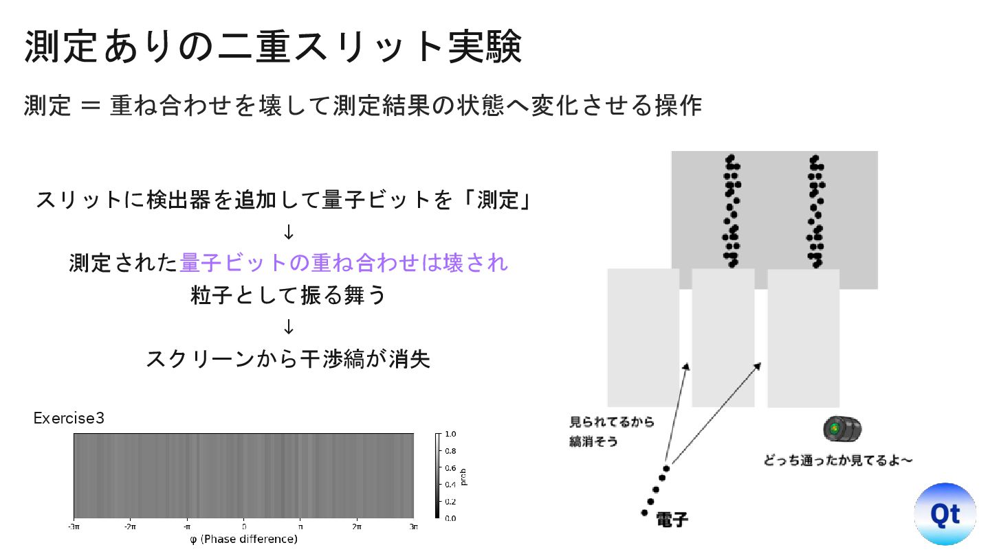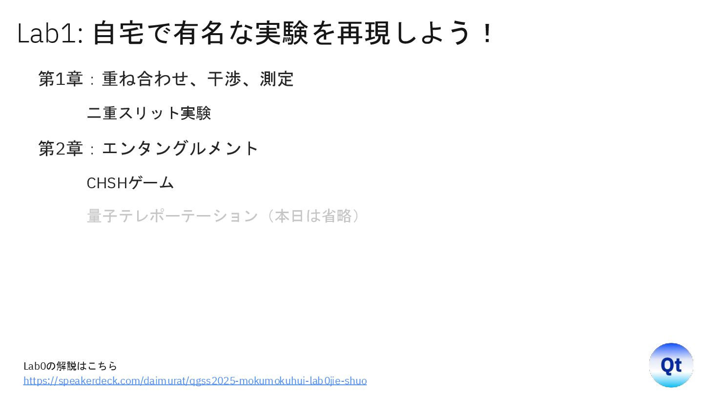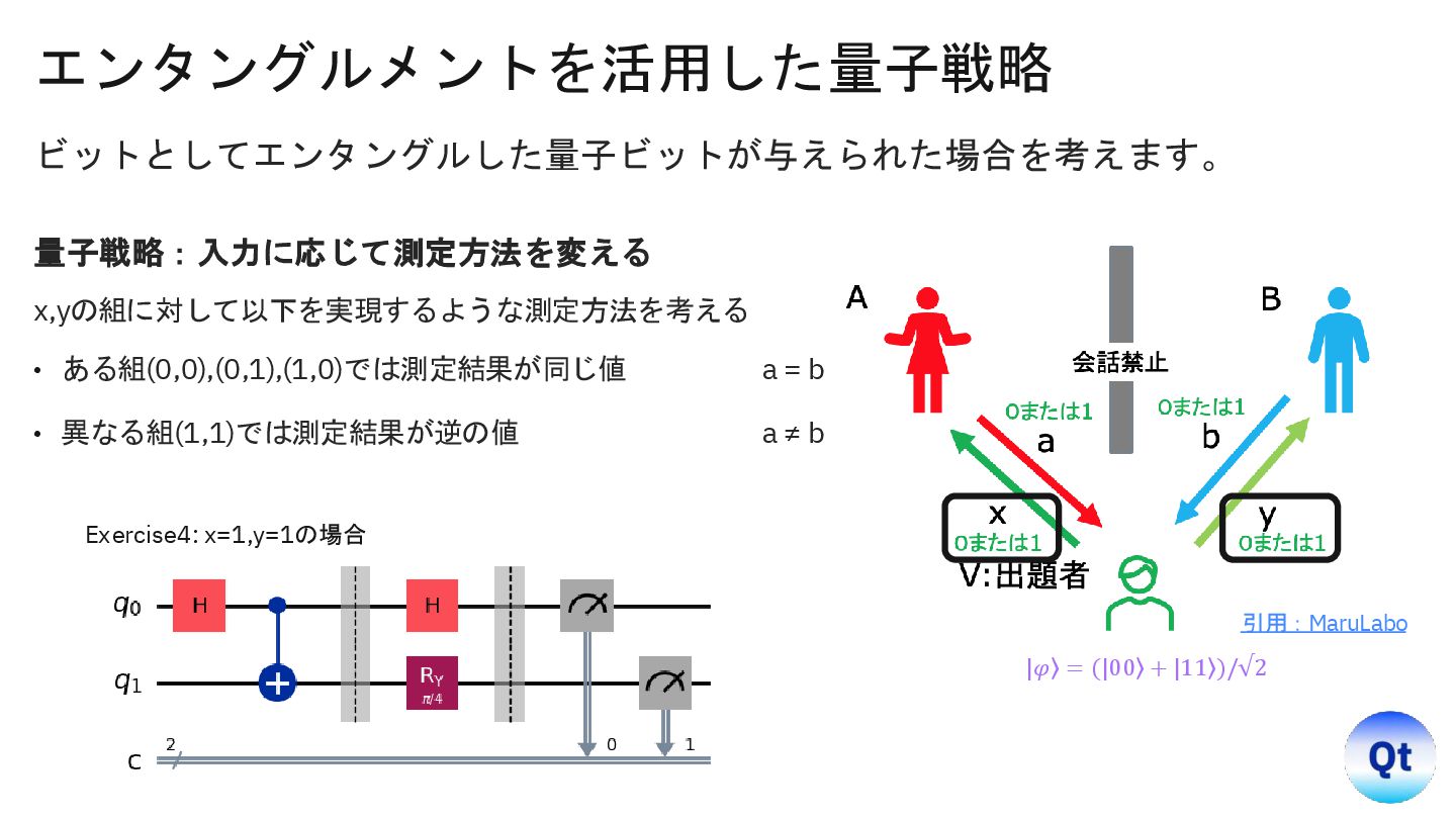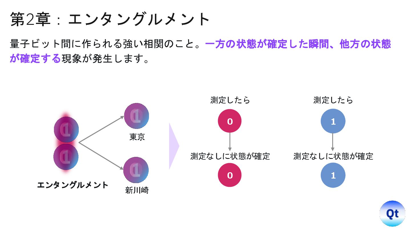 y=0): Target (a XOR b) = 0. Win Probability = 0.8486 Inputs (x=0, y=1): Target (a XOR b) = 0. Win Probability = 0.8457 Inputs (x=1, y=0): Target (a XOR b) = 0. Win Probability = 0.8604 Inputs (x=1, y=1): Target (a XOR b) = 1. Win Probability = 0.8486 示唆 • 結果は「常に決まった値を持つ」という常識を破り、 「測定で初めて確定する」確率的プロセスである。 • しかも空間的に離れた相手と非古典的に強い相関 (エンタングルメント)で結び付いている。