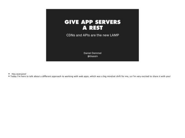 talked about the problem, let me walk you through the promise of this fabled new way of doing things • The piped water in my little story at the beginning represented a new approach, which can be described as “distributed asset delivery with serverless computing” • So there are two important parts in this – admittedly quite long – name: • Firstly, the distributed asset delivery means finding a way to deliver a web app’s assets (be that HTML, CSS, Javascript, images, fonts, videos, and so on) from a web server as close to visitors as possible • Secondly, to handle any sort of user interaction which needs data manipulation, communication, payments or any action really, in a way which avoids running your own, persistent app servers