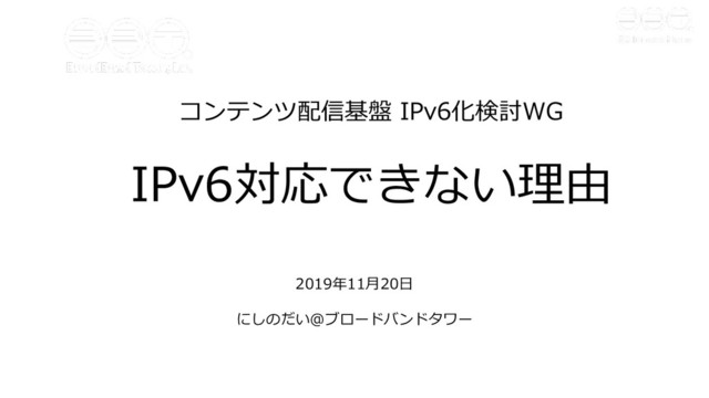 コンテンツ配信基盤 IPv6化検討WG IPv6対応できない理由 2019年11⽉20⽇ にしのだい@ブロードバンドタワー