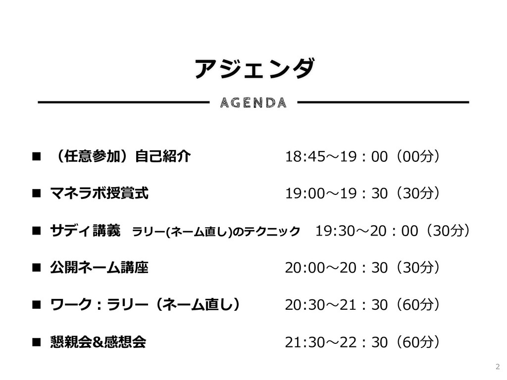 n (任意参加)⾃⼰紹介 18:45〜19:00(00分) n マネラボ授賞式 19:00〜19:30(30分) n サディ講義 ラリー(ネーム直し)のテクニック 19:30〜20:00(30分)