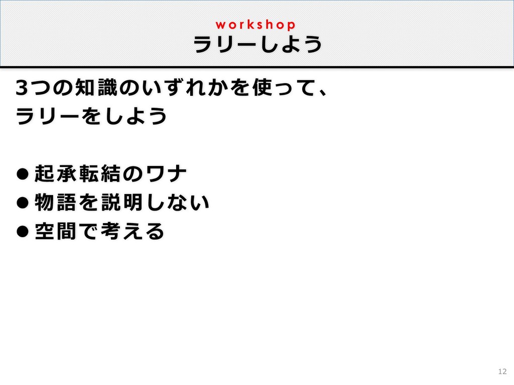 3つの知識のいずれかを使って、 ラリーをしよう l 起承転結のワナ l 物語を説明しない l 空間で考える 12 w