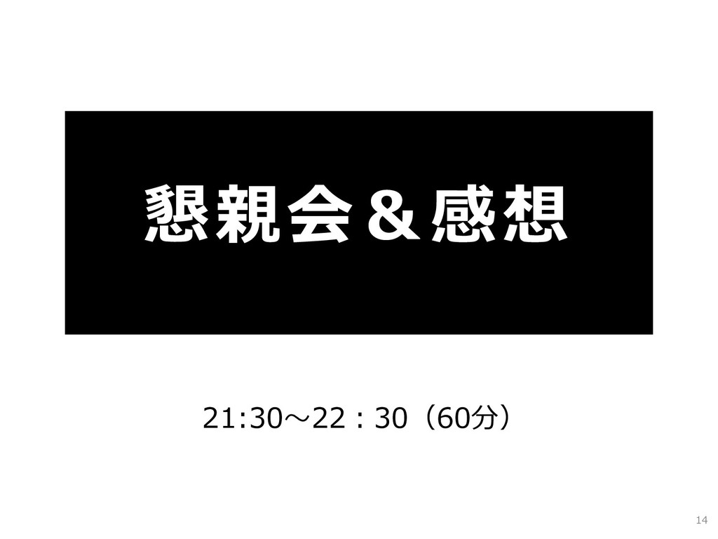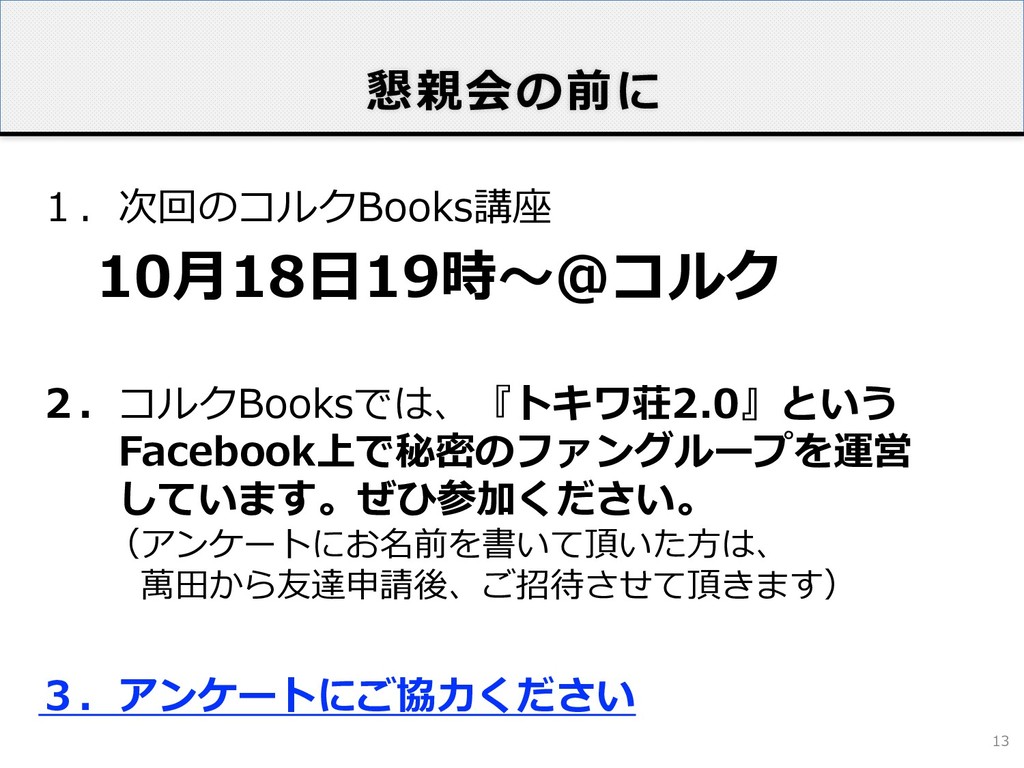 1.次回のコルクBooks講座 10⽉18⽇19時〜@コルク 2.コルクBooksでは、『トキワ荘2.0』という Facebook上で秘密のファングループを運営 しています。ぜひ参加ください。 (アンケートにお名前を書いて頂いた⽅は、 萬⽥から友達申請後、ご招待させて頂きます) 3.アンケートにご協⼒ください 13 懇親会の前に