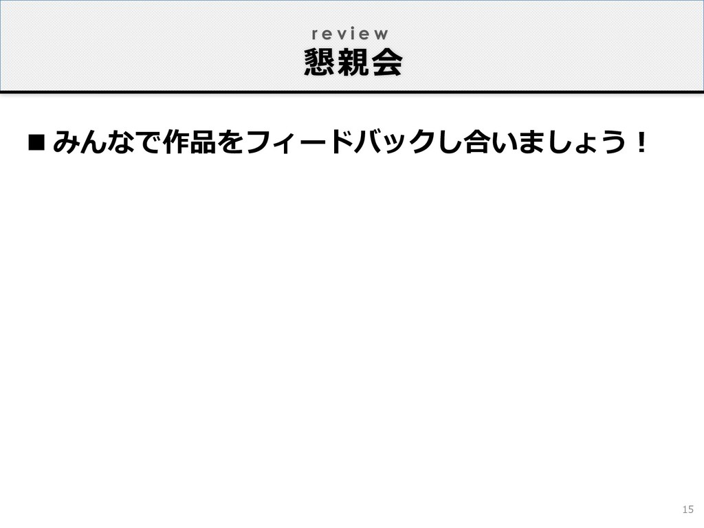 n みんなで作品をフィードバックし合いましょう! 15 r e v i e w 懇親会