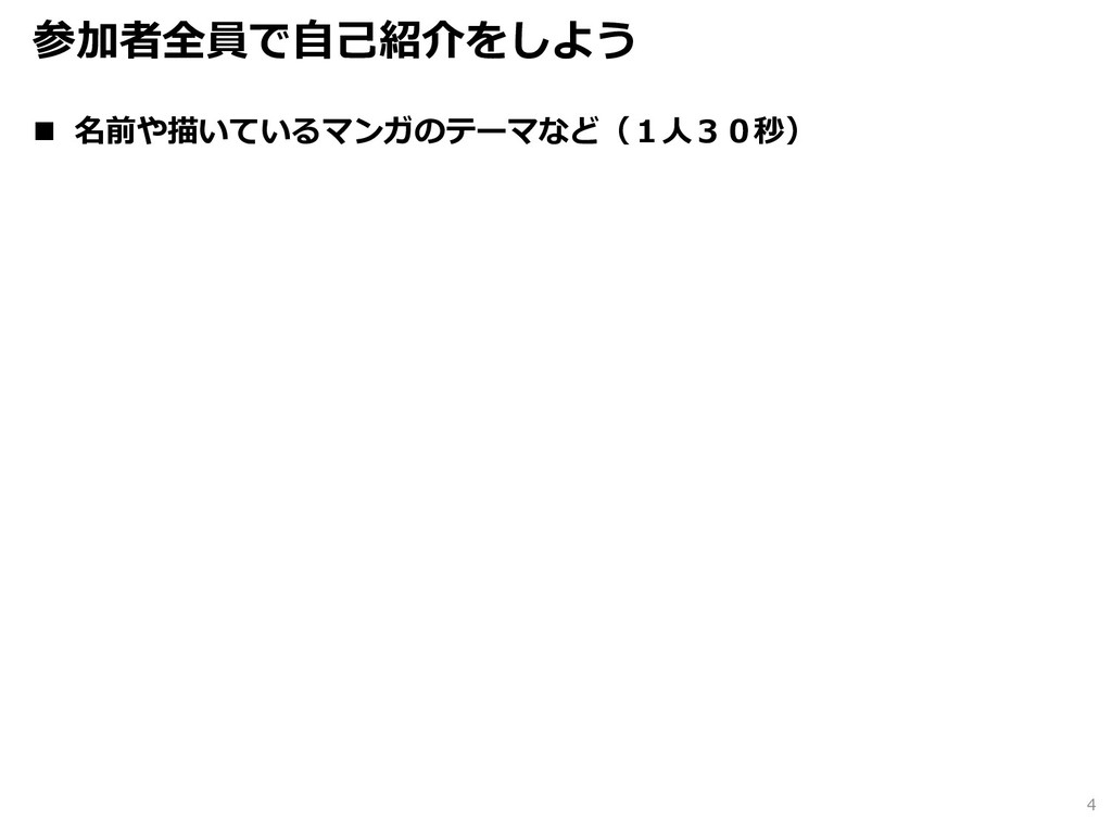 参加者全員で⾃⼰紹介をしよう n 名前や描いているマンガのテーマなど(1⼈30秒) 4