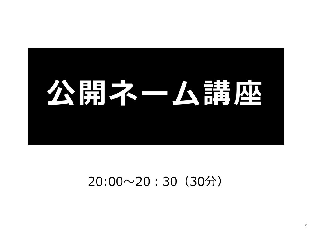 n 公開ネーム講座 20:00〜20:30(30分) n ワーク:ラリー(ネーム直し) 20:30〜21:30(60分) n 懇親会&感想会 21:30〜22:30(60分) 2 アジェンダ