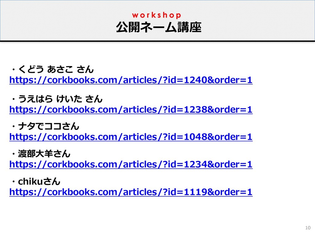 ・渡部⼤⽺さん https://corkbooks.com/articles/?id=1234&order=1 ・chikuさん https://corkbooks.com/articles/?id=1119&order=1 10 w o r k s h o p 公開ネーム講座