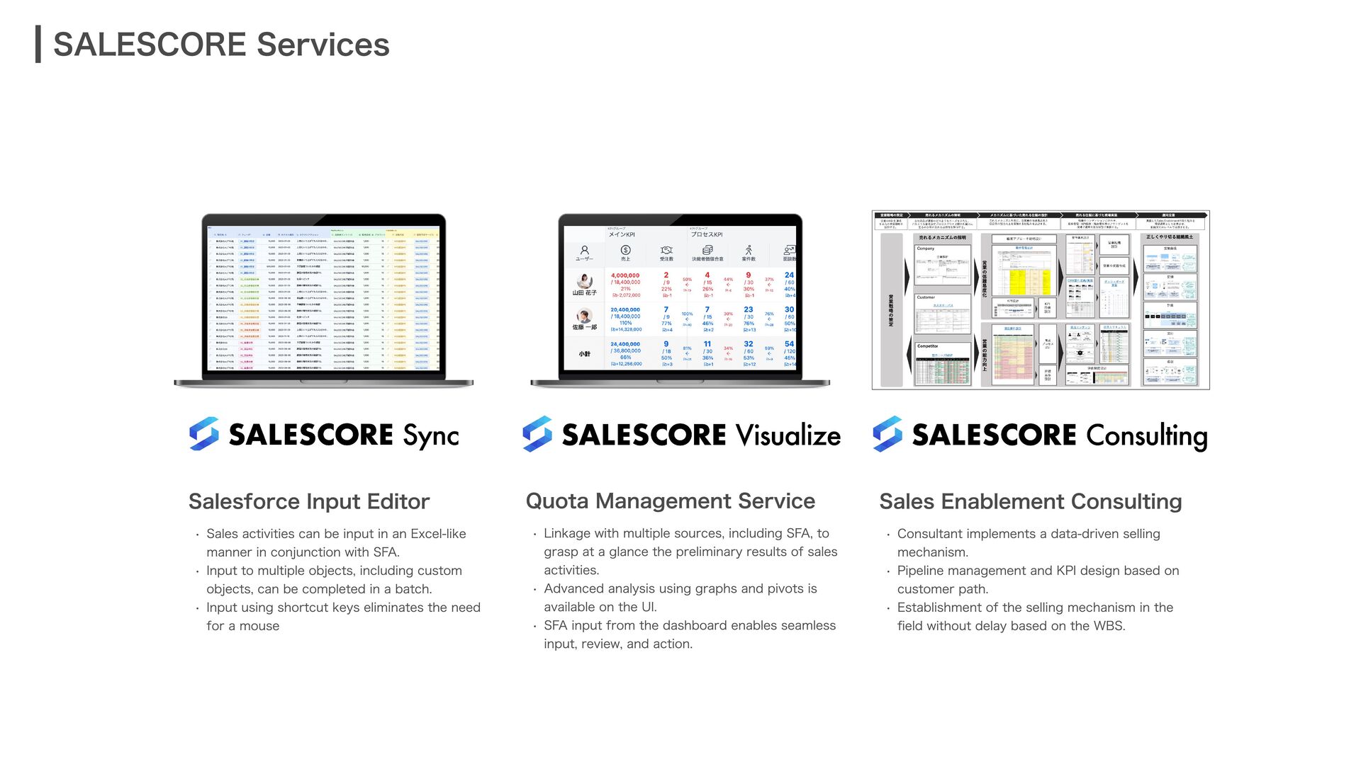input in an Excel-like manner in conjunction with SFAa Q Input to multiple objects, including custom objects, can be completed in a batcha Q Input using shortcut keys eliminates the need for a mouse Quota Management Servich Q Linkage with multiple sources, including SFA, to grasp at a glance the preliminary results of sales activitiesa Q Advanced analysis using graphs and pivots is available on the UIa Q SFA input from the dashboard enables seamless input, review, and action. Sales Enablement Consultin¤ Q Consultant implements a data-driven selling mechanisma Q Pipeline management and KPI design based on customer patha Q Establishment of the selling mechanism in the field without delay based on the WBS.