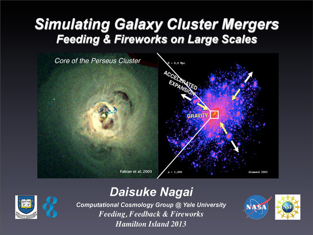A talk on "Simulating Galaxy Cluster Mergers" by Daisuke Nagai at the Feeding, Feedback, Fireworks conference, Hamilton Island, Australia in June, 2013.