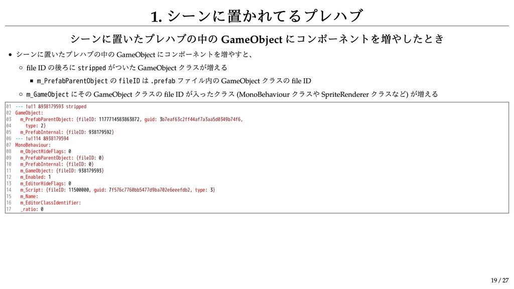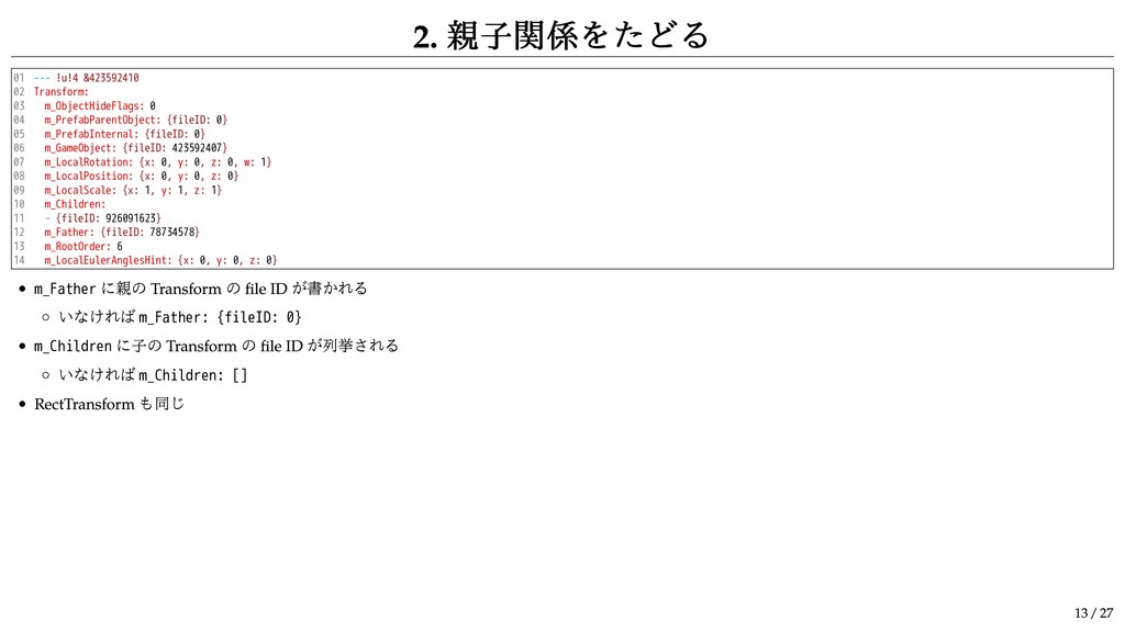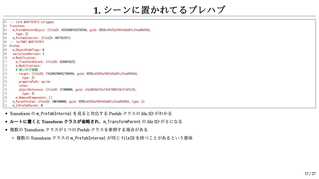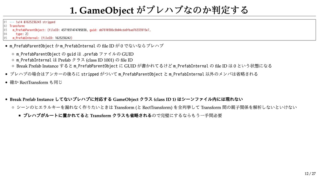&1625236243 stripped Transform: m_PrefabParentObject: {fileID: 4371931474705838, guid: dd7810386c8b04cda9fbad76333915e7, type: 2} m_PrefabInternal: {fileID: 1625236242} m_PrefabParentObject か m_PrefabInternal の file ID が 0 でないならプレハブ m_PrefabParentObject の guid は .prefab ファイルの GUID m_PrefabInternal は Prefab クラス (class ID 1001) の file ID Break Prefab Instance すると m_PrefabParentObject に GUID が書かれてるけど m_PrefabInternal の file ID は 0 という状態になる プレハブの場合はアンカーの後ろに stripped がついて m_PrefabParentObject と m_PrefabInternal 以外のメンバは省略される 確か RectTransform も同じ Break Prefab Instance してないプレハブに対応する GameObject クラス (class ID 1) はシーンファイル内には現れない シーンのヒエラルキーを漏れなく作りたいときは Transform ( と RectTransform) を全列挙して Transform 間の親子関係を解析しないといけない プレハブがルートに置かれてると Transform クラスも省略されるので完璧にするならもう一手間必要 12 / 27