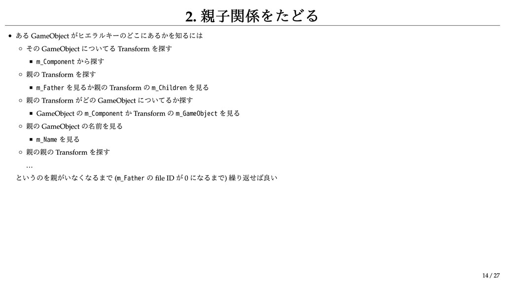 m_Component から探す 親の Transform を探す m_Father を見るか親の Transform の m_Children を見る 親の Transform がどの GameObject についてるか探す GameObject の m_Component か Transform の m_GameObject を見る 親の GameObject の名前を見る m_Name を見る 親の親の Transform を探す … というのを親がいなくなるまで ( m_Father の file ID が 0 になるまで) 繰り返せば良い 14 / 27
