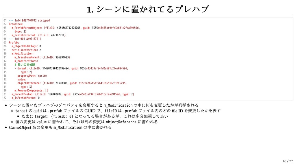 09 10 11 12 13 14 15 16 17 18 19 20 21 22 --- !u!4 &497167812 stripped Transform: m_PrefabParentObject: {fileID: 4334360742576768, guid: 9355c43433af94fd3a601c2fea09459d, type: 2} m_PrefabInternal: {fileID: 497167811} --- !u!1001 &497167811 Prefab: m_ObjectHideFlags: 0 serializedVersion: 2 m_Modification: m_TransformParent: {fileID: 926091623} m_Modifications: # 長いので省略 - target: {fileID: 114204290452199494, guid: 9355c43433af94fd3a601c2fea09459d, type: 2} propertyPath: sprite value: objectReference: {fileID: 21300000, guid: a1b2042b5f5ef7b41896510c51df5c95, type: 3} m_RemovedComponents: [] m_ParentPrefab: {fileID: 100100000, guid: 9355c43433af94fd3a601c2fea09459d, type: 2} m_IsPrefabParent: 0 シーンに置いたプレハブのプロパティを変更すると m_Modification の中に何を変更したかが列挙される target の guid は .prefab ファイルの GUID で、fileID は .prefab ファイル内のどの file ID を変更したかを表す たまに target: {fileID: 0} となってる場合があるが、これは多分無視して良い 値の変更は value に書かれて、それ以外の変更は objectReference に書かれる GameObject 名の変更も m_Modification の中に書かれる 16 / 27