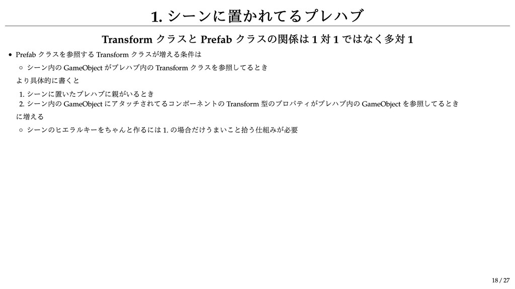 1 Prefab クラスを参照する Transform クラスが増える条件は シーン内の GameObject がプレハブ内の Transform クラスを参照してるとき より具体的に書くと 1. シーンに置いたプレハブに親がいるとき 2. シーン内の GameObject にアタッチされてるコンポーネントの Transform 型のプロパティがプレハブ内の GameObject を参照してるとき に増える シーンのヒエラルキーをちゃんと作るには 1. の場合だけうまいこと拾う仕組みが必要 18 / 27