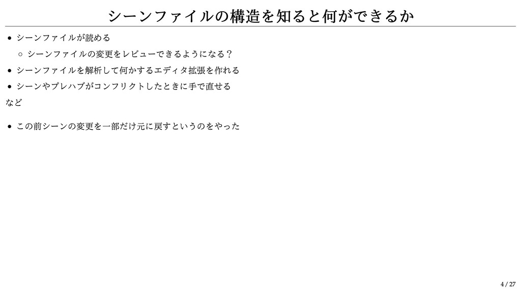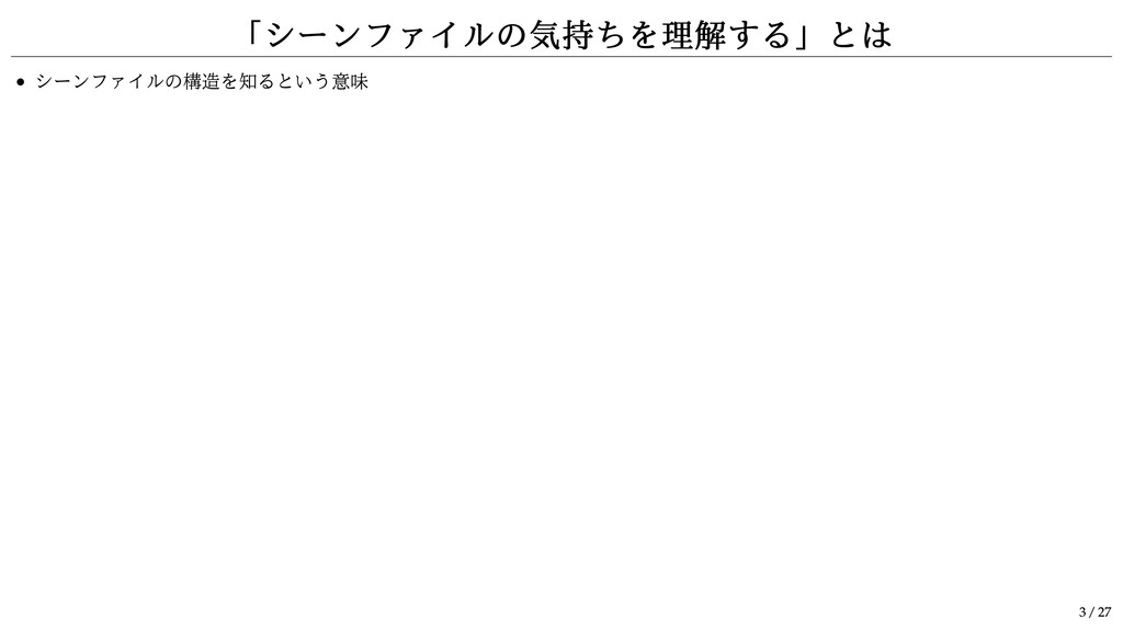 「シーンファイルの気持ちを理解する」とは シーンファイルの構造を知るという意味 3 / 27