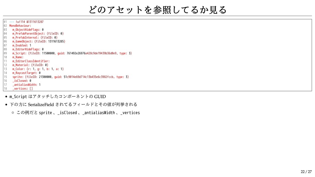 10 11 12 13 14 15 16 17 18 --- !u!114 &1311613287 MonoBehaviour: m_ObjectHideFlags: 0 m_PrefabParentObject: {fileID: 0} m_PrefabInternal: {fileID: 0} m_GameObject: {fileID: 1311613285} m_Enabled: 1 m_EditorHideFlags: 0 m_Script: {fileID: 11500000, guid: 761492e26976a428c9de19439b36d0e9, type: 3} m_Name: m_EditorClassIdentifier: m_Material: {fileID: 0} m_Color: {r: 1, g: 1, b: 1, a: 1} m_RaycastTarget: 0 sprite: {fileID: 21300000, guid: 51c9014e69d714c13b435e6c3982fccb, type: 3} _isClosed: 0 _antialiasWidth: 1 _vertices: [] m_Script はアタッチしたコンポーネントの GUID 下の方に SerializeField されてるフィールドとその値が列挙される この例だと sprite 、_isClosed 、_antialiasWidth 、_vertices 22 / 27