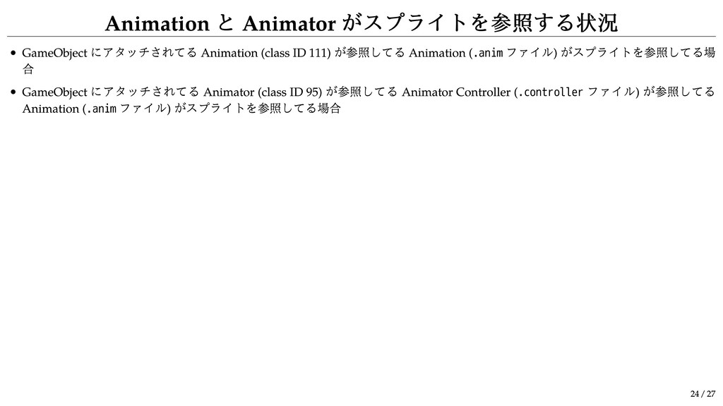 が参照してる Animation ( .anim ファイル) がスプライトを参照してる場 合 GameObject にアタッチされてる Animator (class ID 95) が参照してる Animator Controller ( .controller ファイル) が参照してる Animation ( .anim ファイル) がスプライトを参照してる場合 24 / 27