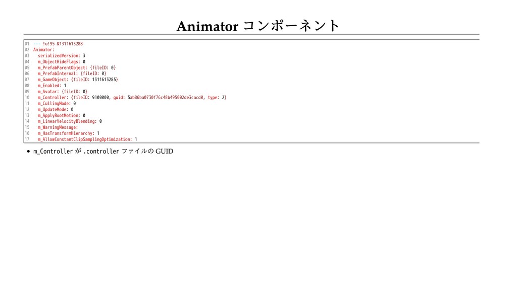 09 10 11 12 13 14 15 16 17 --- !u!95 &1311613288 Animator: serializedVersion: 3 m_ObjectHideFlags: 0 m_PrefabParentObject: {fileID: 0} m_PrefabInternal: {fileID: 0} m_GameObject: {fileID: 1311613285} m_Enabled: 1 m_Avatar: {fileID: 0} m_Controller: {fileID: 9100000, guid: 5ab86ba0730f76c48b495002de3cacd0, type: 2} m_CullingMode: 0 m_UpdateMode: 0 m_ApplyRootMotion: 0 m_LinearVelocityBlending: 0 m_WarningMessage: m_HasTransformHierarchy: 1 m_AllowConstantClipSamplingOptimization: 1 m_Controller が .controller ファイルの GUID