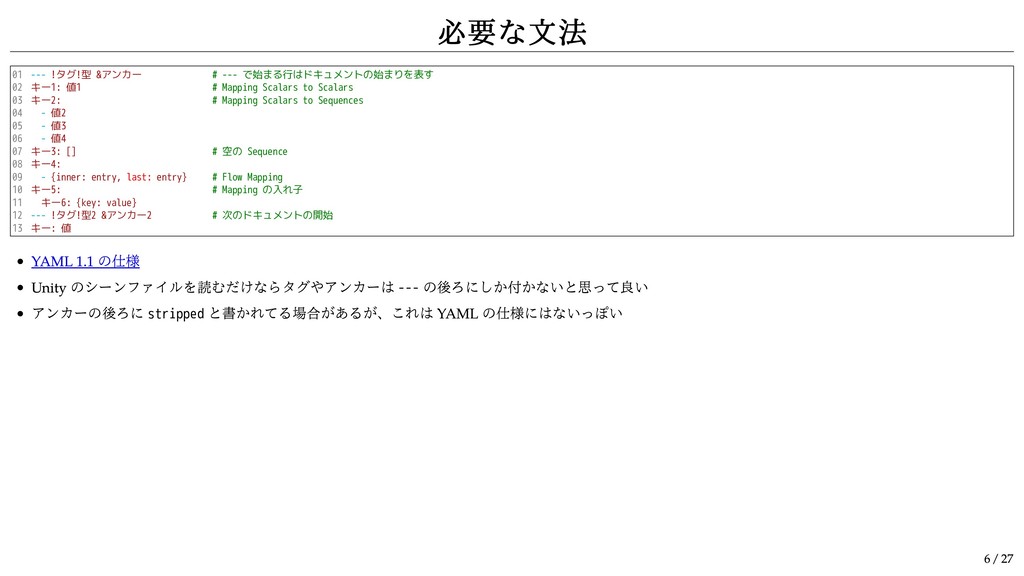 10 11 12 13 --- !タグ!型 &アンカー # --- で始まる行はドキュメントの始まりを表す キー1: 値1 # Mapping Scalars to Scalars キー2: # Mapping Scalars to Sequences - 値2 - 値3 - 値4 キー3: [] # 空の Sequence キー4: - {inner: entry, last: entry} # Flow Mapping キー5: # Mapping の入れ子 キー6: {key: value} --- !タグ!型2 &アンカー2 # 次のドキュメントの開始 キー: 値 YAML 1.1 の仕様 Unity のシーンファイルを読むだけならタグやアンカーは --- の後ろにしか付かないと思って良い アンカーの後ろに stripped と書かれてる場合があるが、これは YAML の仕様にはないっぽい 6 / 27