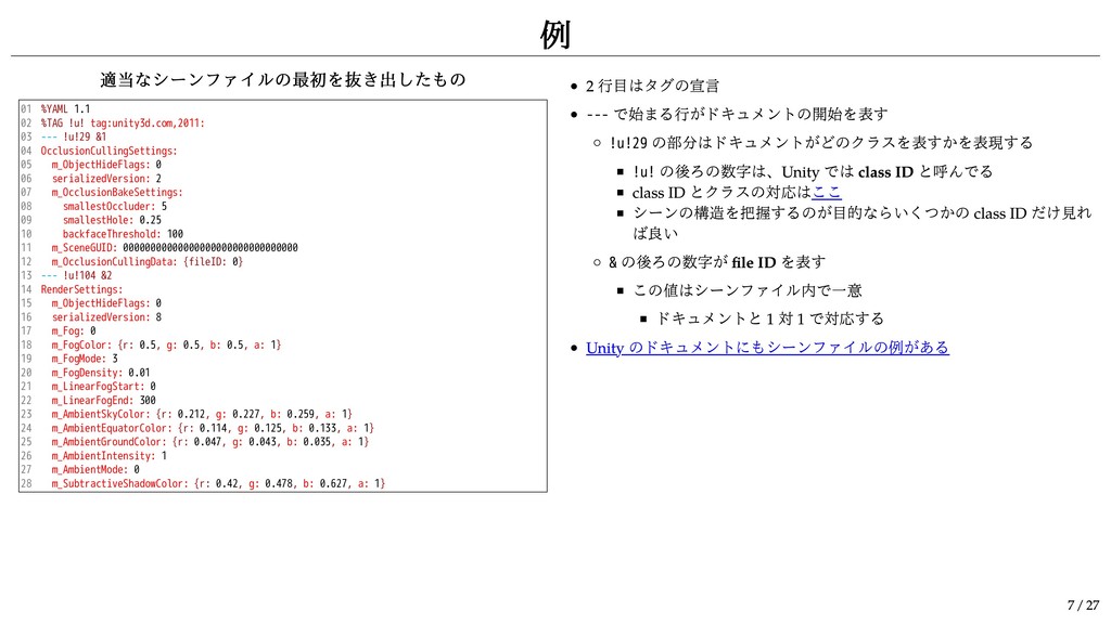 10 11 12 13 14 15 16 17 18 19 20 21 22 23 24 25 26 27 28 %YAML 1.1 %TAG !u! tag:unity3d.com,2011: --- !u!29 &1 OcclusionCullingSettings: m_ObjectHideFlags: 0 serializedVersion: 2 m_OcclusionBakeSettings: smallestOccluder: 5 smallestHole: 0.25 backfaceThreshold: 100 m_SceneGUID: 00000000000000000000000000000000 m_OcclusionCullingData: {fileID: 0} --- !u!104 &2 RenderSettings: m_ObjectHideFlags: 0 serializedVersion: 8 m_Fog: 0 m_FogColor: {r: 0.5, g: 0.5, b: 0.5, a: 1} m_FogMode: 3 m_FogDensity: 0.01 m_LinearFogStart: 0 m_LinearFogEnd: 300 m_AmbientSkyColor: {r: 0.212, g: 0.227, b: 0.259, a: 1} m_AmbientEquatorColor: {r: 0.114, g: 0.125, b: 0.133, a: 1} m_AmbientGroundColor: {r: 0.047, g: 0.043, b: 0.035, a: 1} m_AmbientIntensity: 1 m_AmbientMode: 0 m_SubtractiveShadowColor: {r: 0.42, g: 0.478, b: 0.627, a: 1} 2 行目はタグの宣言 --- で始まる行がドキュメントの開始を表す !u!29 の部分はドキュメントがどのクラスを表すかを表現する !u! の後ろの数字は、Unity では class ID と呼んでる class ID とクラスの対応はここ シーンの構造を把握するのが目的ならいくつかの class ID だけ見れ ば良い & の後ろの数字が file ID を表す この値はシーンファイル内で一意 ドキュメントと 1 対 1 で対応する Unity のドキュメントにもシーンファイルの例がある 例 7 / 27