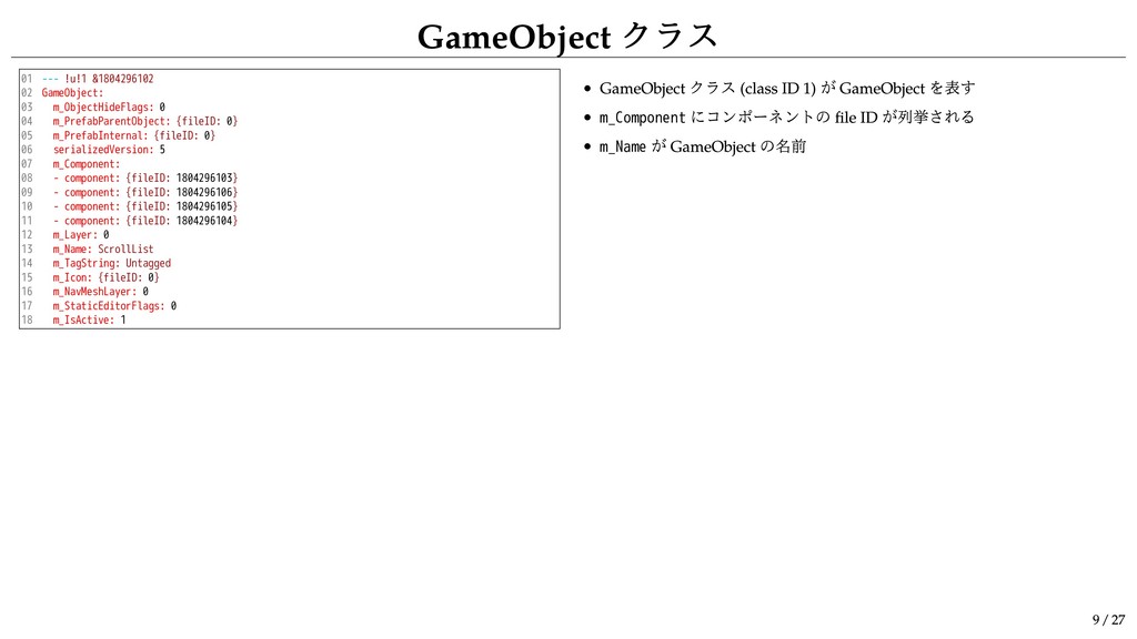 11 12 13 14 15 16 17 18 --- !u!1 &1804296102 GameObject: m_ObjectHideFlags: 0 m_PrefabParentObject: {fileID: 0} m_PrefabInternal: {fileID: 0} serializedVersion: 5 m_Component: - component: {fileID: 1804296103} - component: {fileID: 1804296106} - component: {fileID: 1804296105} - component: {fileID: 1804296104} m_Layer: 0 m_Name: ScrollList m_TagString: Untagged m_Icon: {fileID: 0} m_NavMeshLayer: 0 m_StaticEditorFlags: 0 m_IsActive: 1 GameObject クラス (class ID 1) が GameObject を表す m_Component にコンポーネントの file ID が列挙される m_Name が GameObject の名前 GameObject クラス 9 / 27