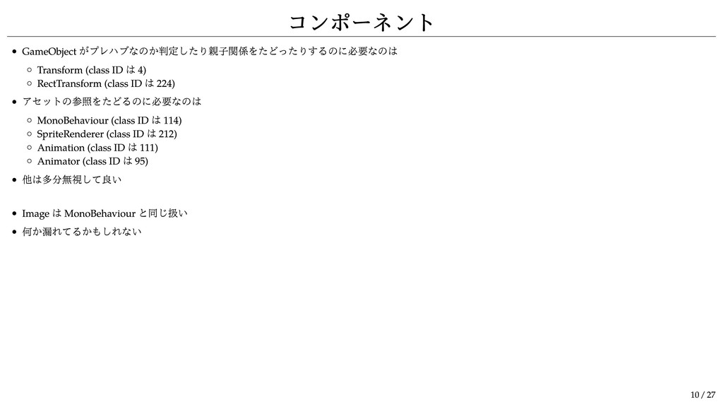 ID は 224) アセットの参照をたどるのに必要なのは MonoBehaviour (class ID は 114) SpriteRenderer (class ID は 212) Animation (class ID は 111) Animator (class ID は 95) 他は多分無視して良い Image は MonoBehaviour と同じ扱い 何か漏れてるかもしれない 10 / 27