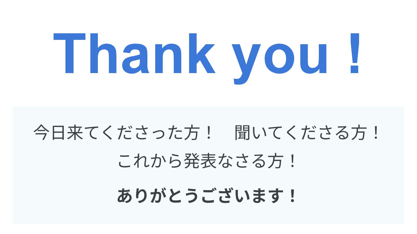 Thank you ! 今⽇来てくださった⽅! 聞いてくださる⽅! これから発表なさる⽅! ありがとうございます!
