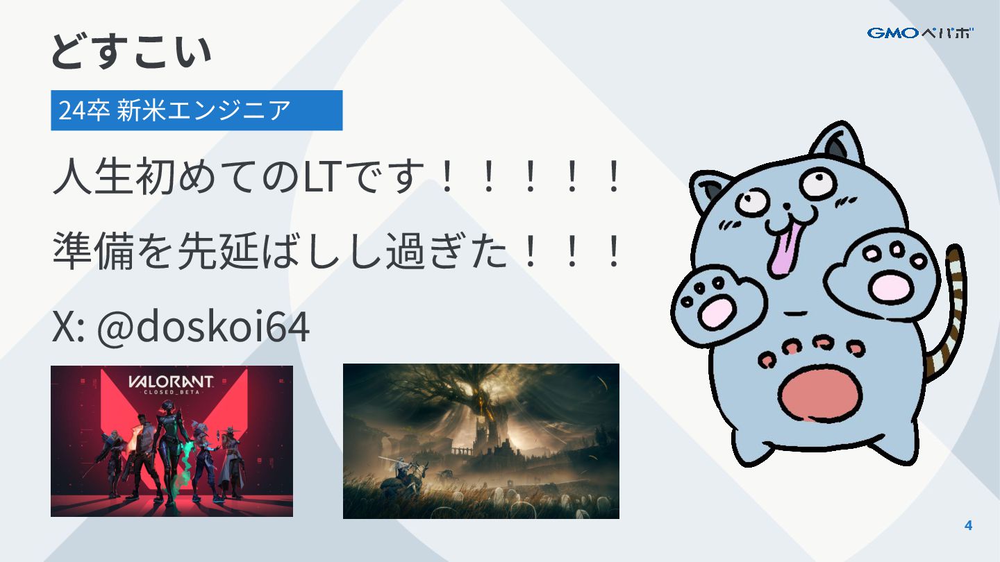 4 24卒 新⽶エンジニア どすこい ⼈⽣初めてのLTです!!!!! 準備を先延ばしし過ぎた!!! X: @doskoi64