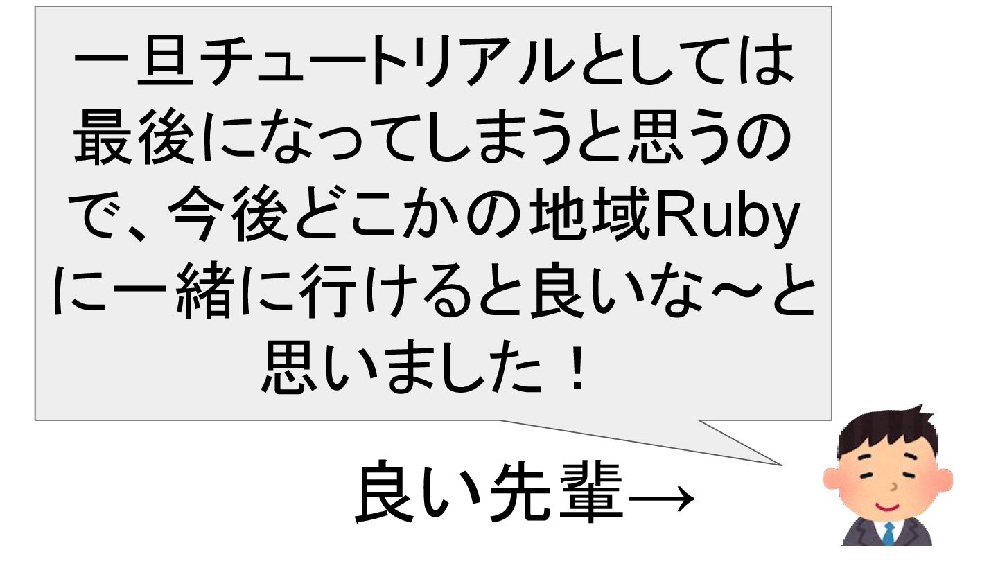 一旦チュートリアルとしては 最後になってしまうと思うの で、今後どこかの地域Ruby に一緒に行けると良いな〜と 思いました! 良い先輩→