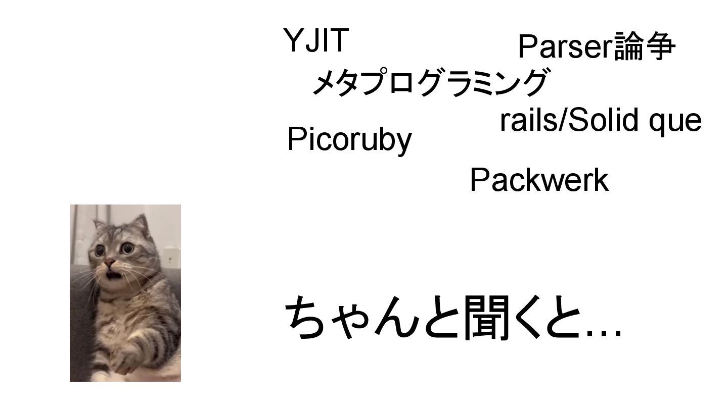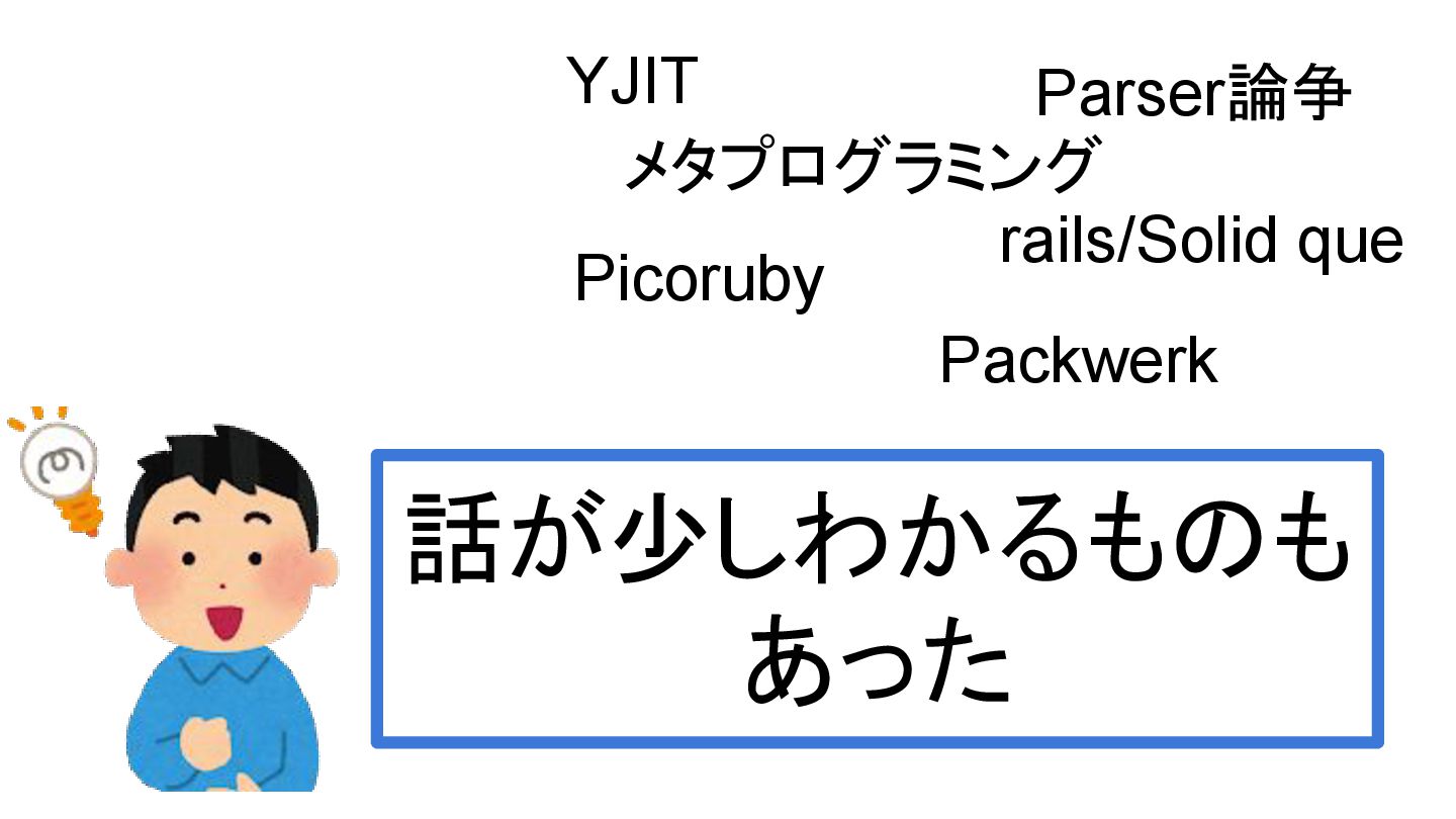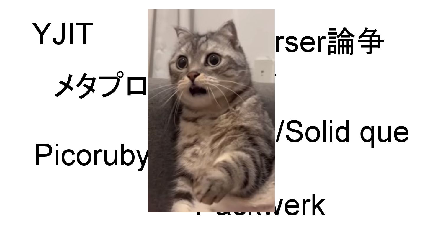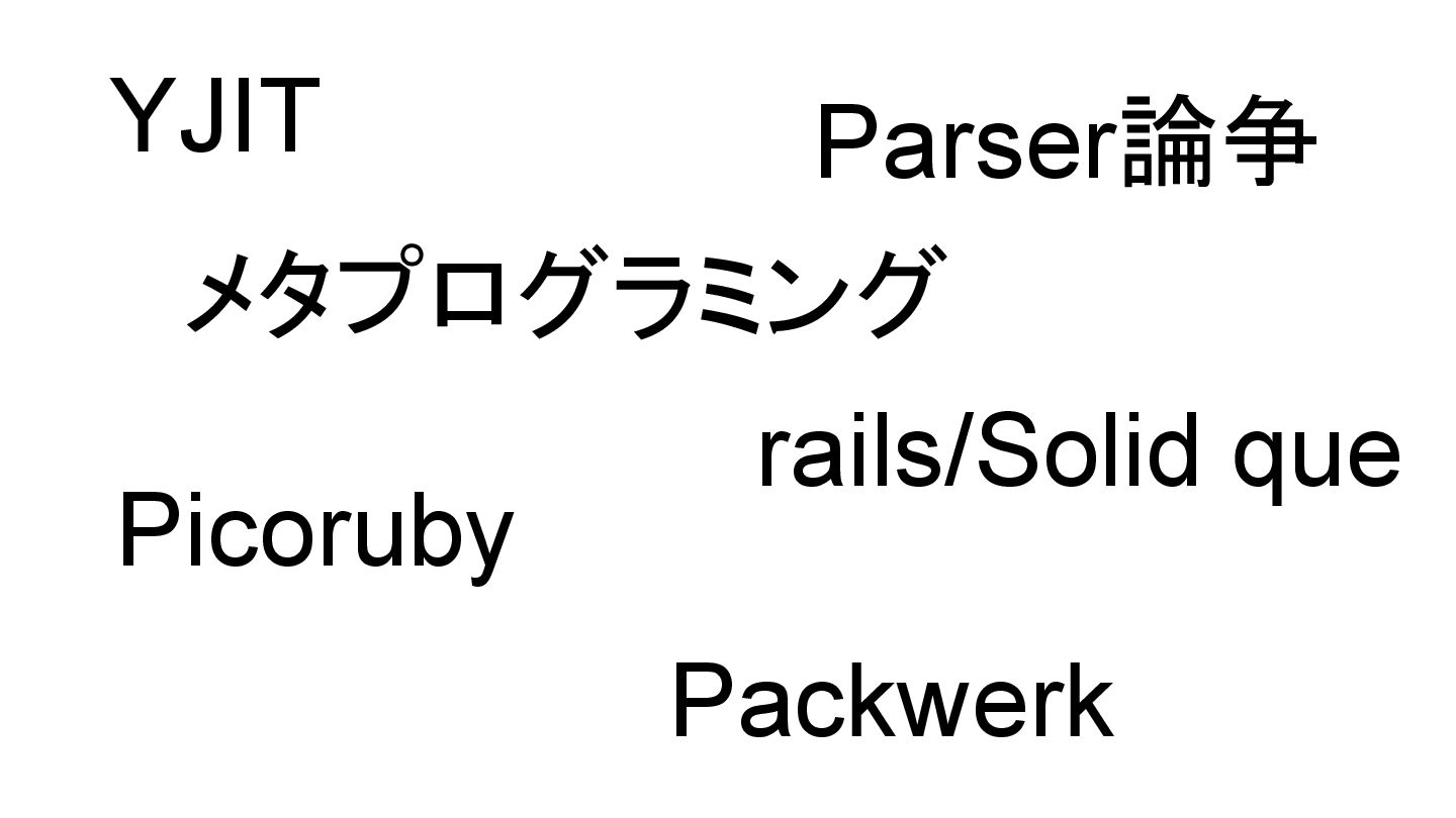 YJIT Parser論争 メタプログラミング rails/Solid que Picoruby Packwerk 話が少しわかるものも あった