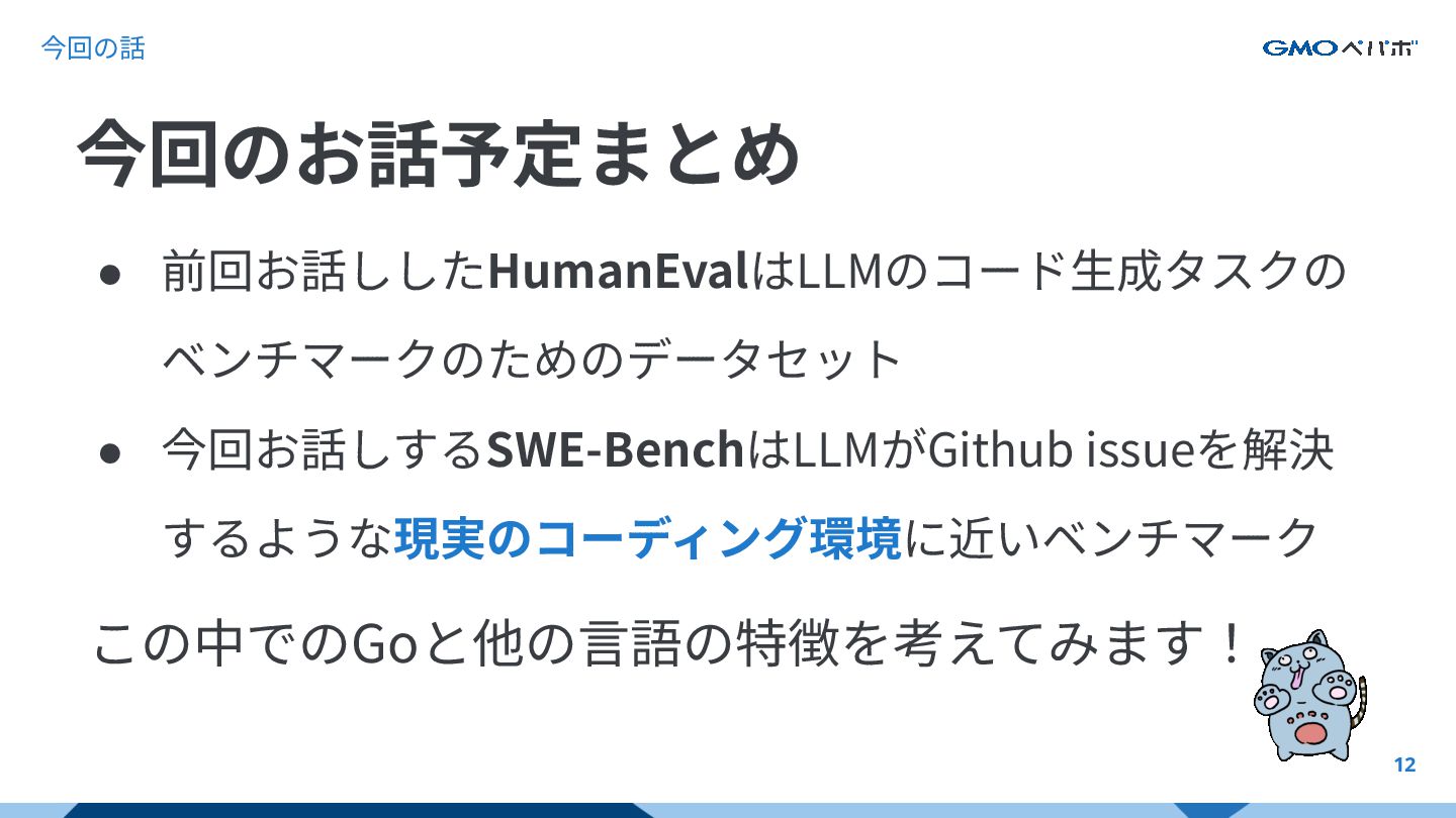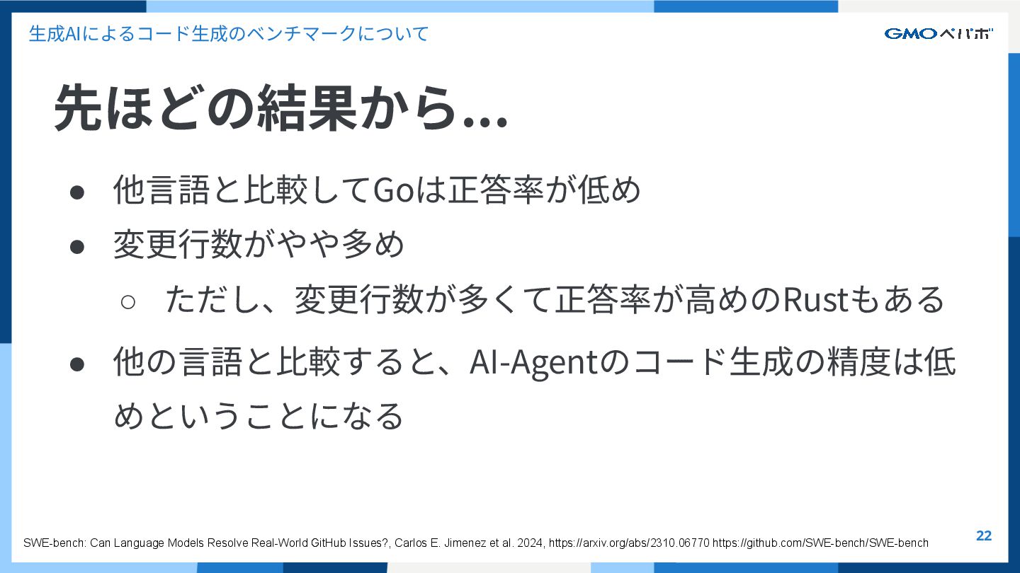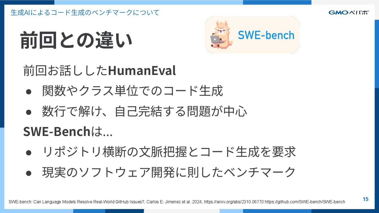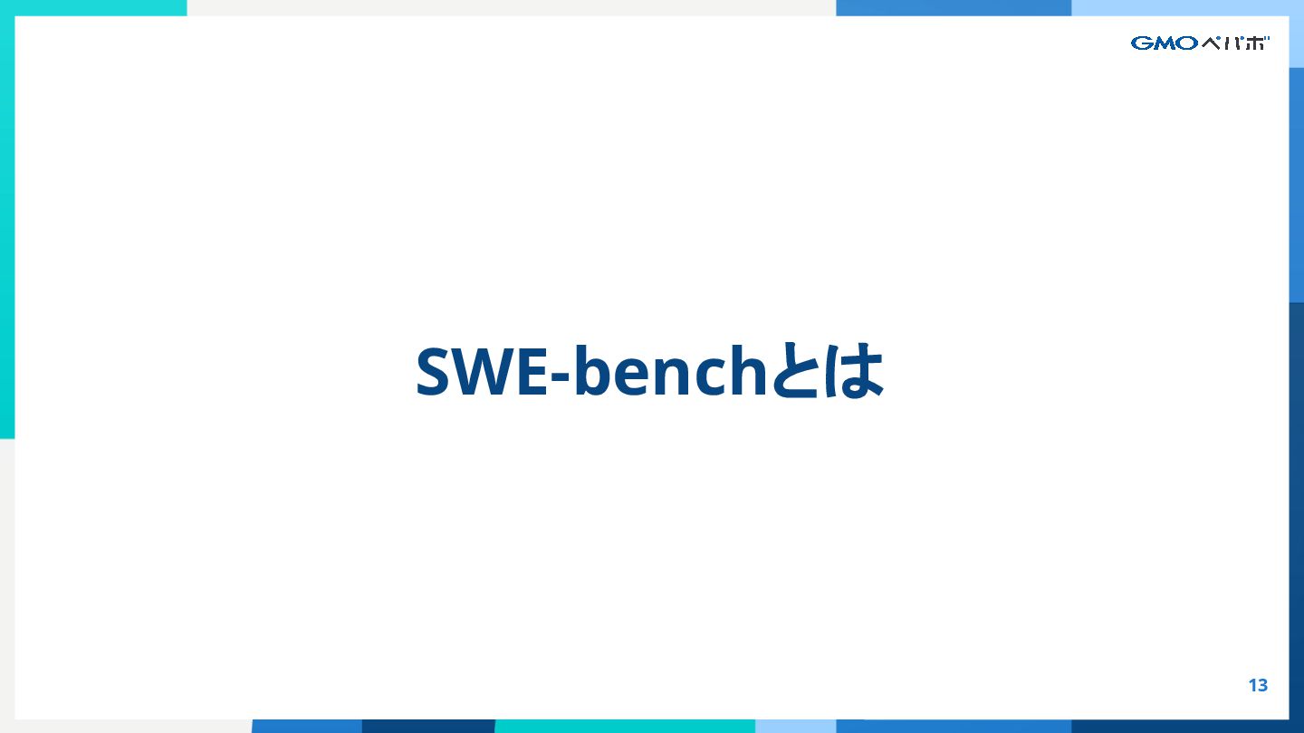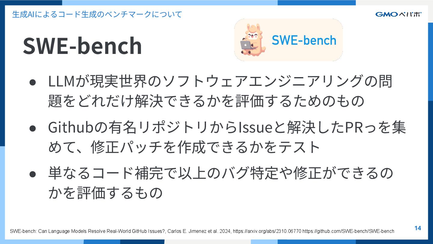 かを評価するもの SWE-bench SWE-bench: Can Language Models Resolve Real-World GitHub Issues?, Carlos E. Jimenez et al. 2024, https://arxiv.org/abs/2310.06770 https://github.com/SWE-bench/SWE-bench