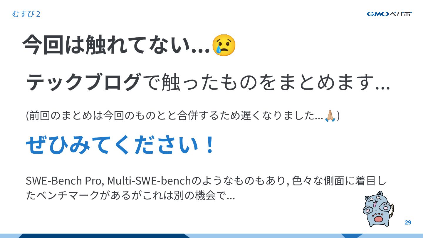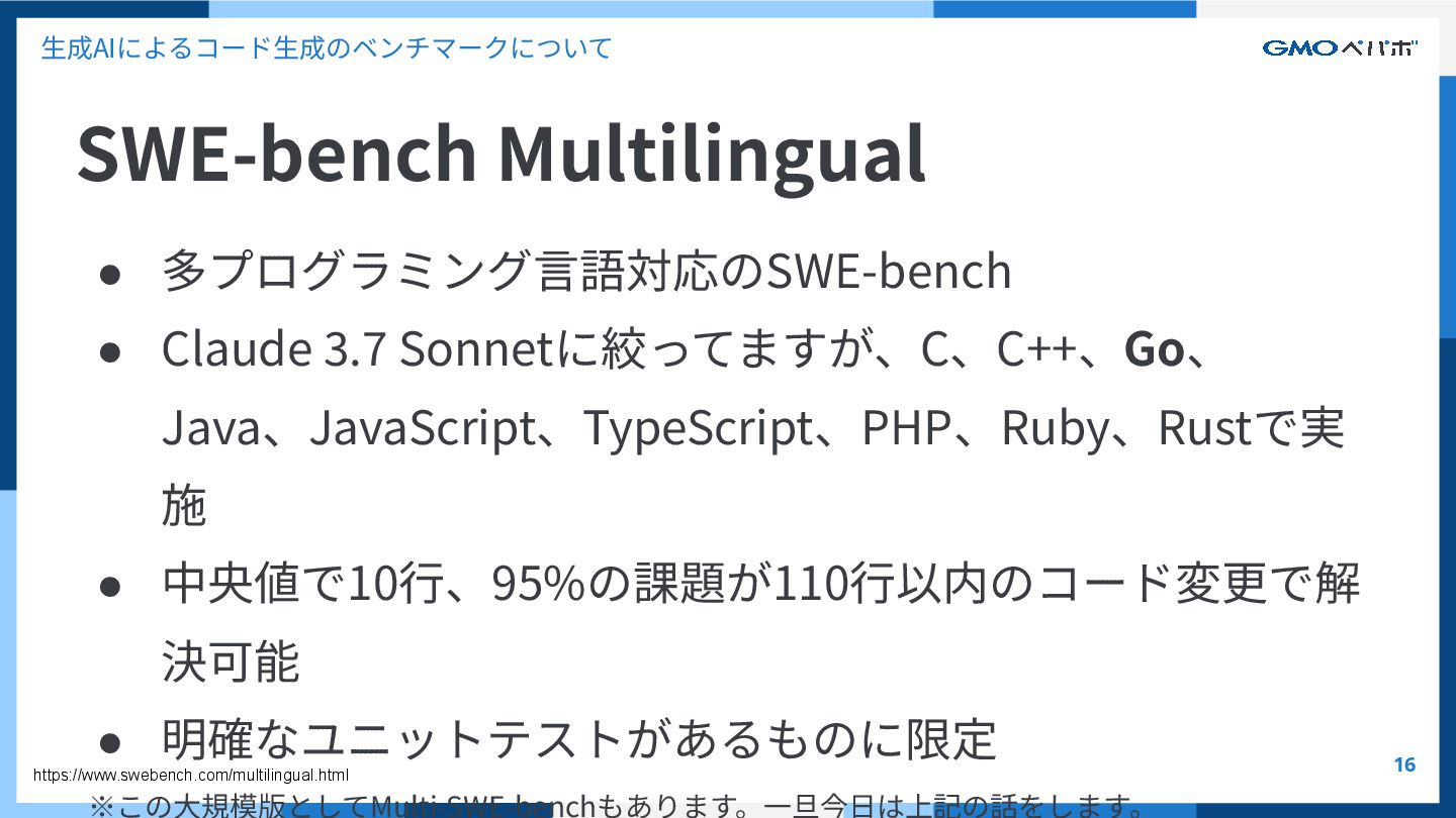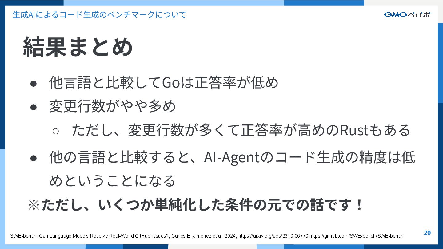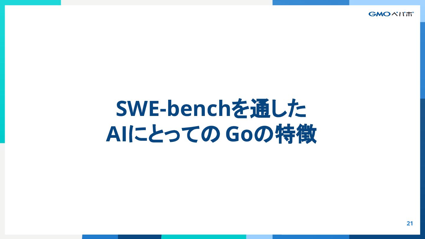かを評価するもの SWE-bench SWE-bench: Can Language Models Resolve Real-World GitHub Issues?, Carlos E. Jimenez et al. 2024, https://arxiv.org/abs/2310.06770 https://github.com/SWE-bench/SWE-bench