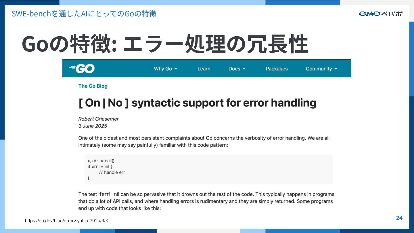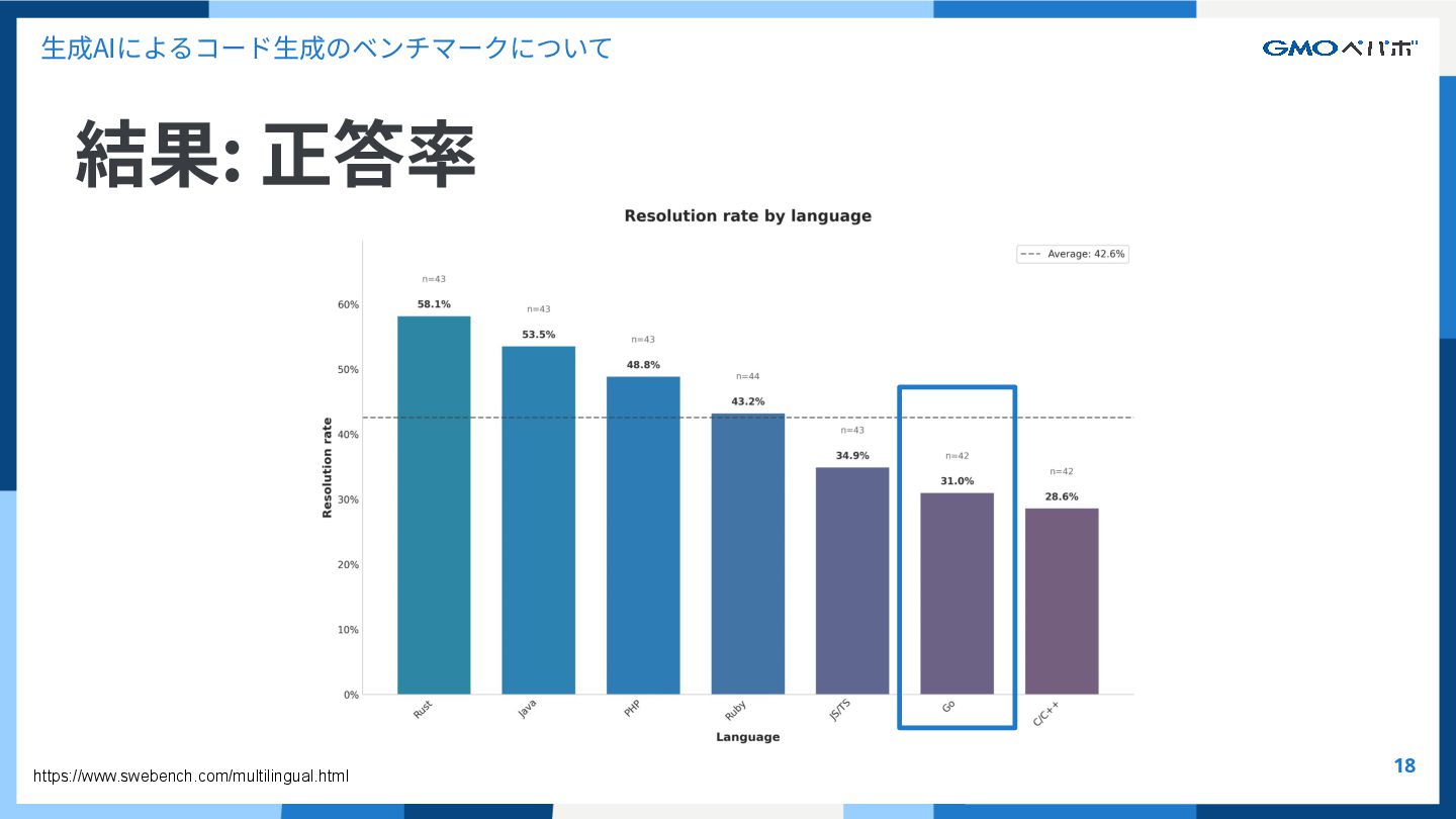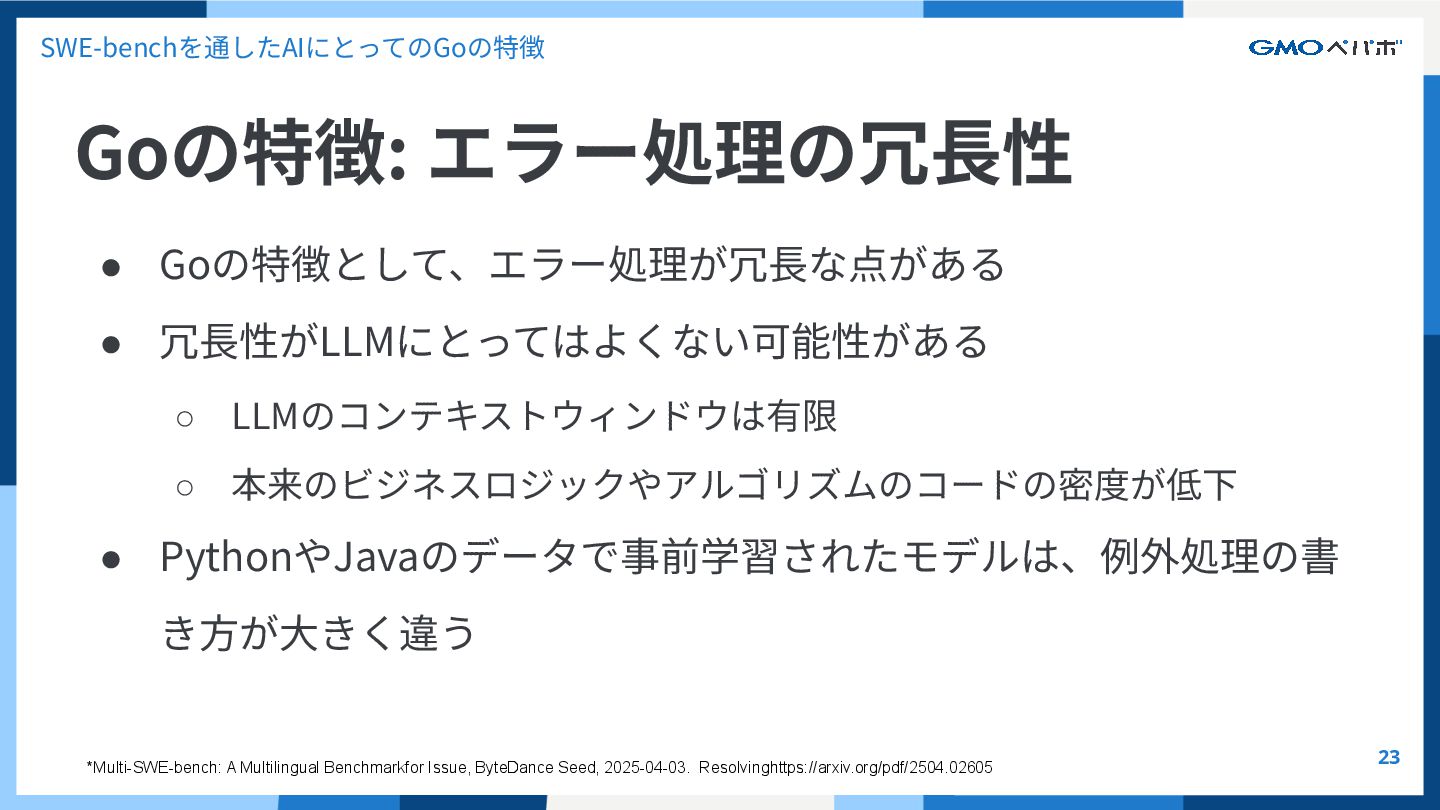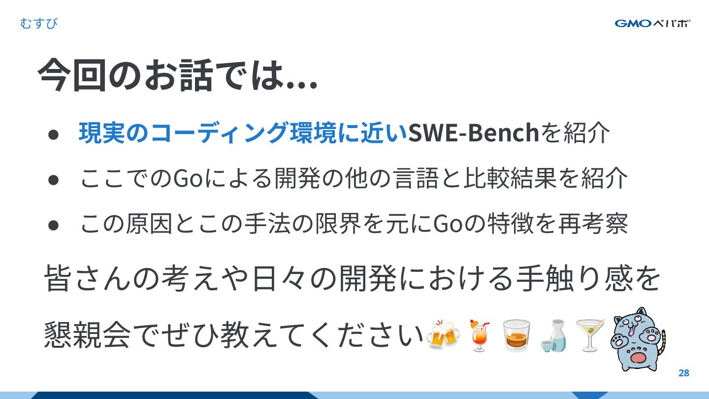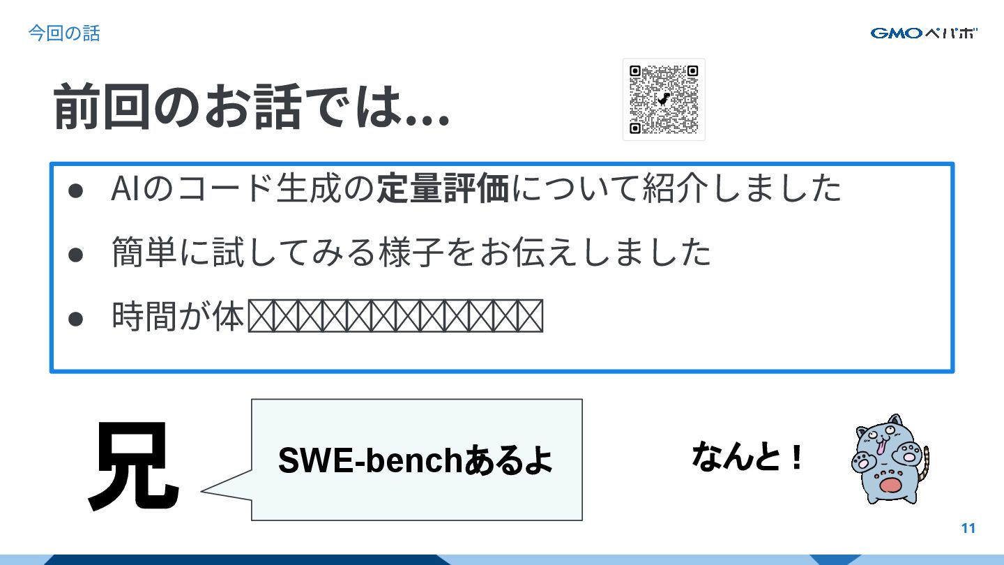 かを評価するもの SWE-bench SWE-bench: Can Language Models Resolve Real-World GitHub Issues?, Carlos E. Jimenez et al. 2024, https://arxiv.org/abs/2310.06770 https://github.com/SWE-bench/SWE-bench